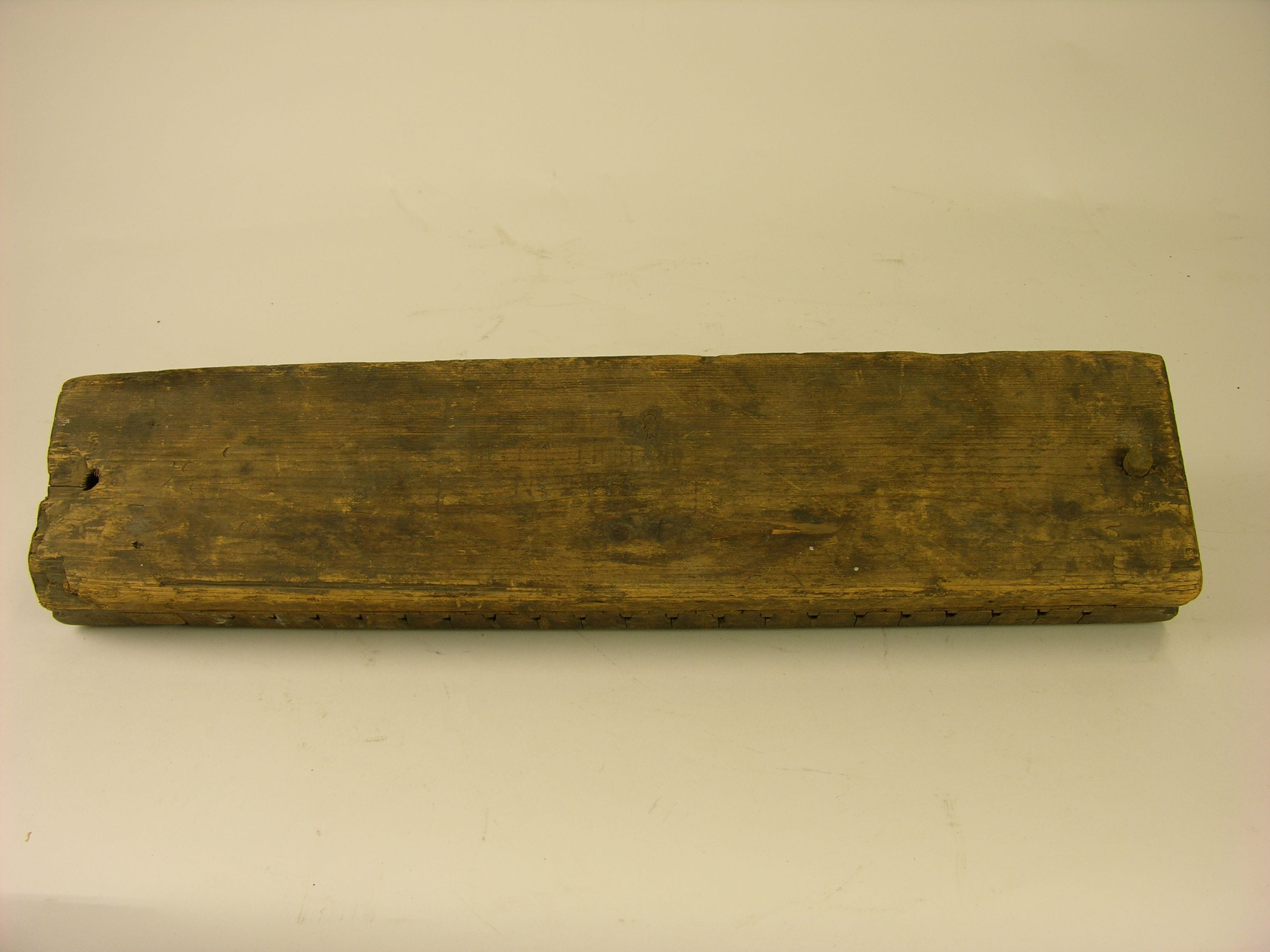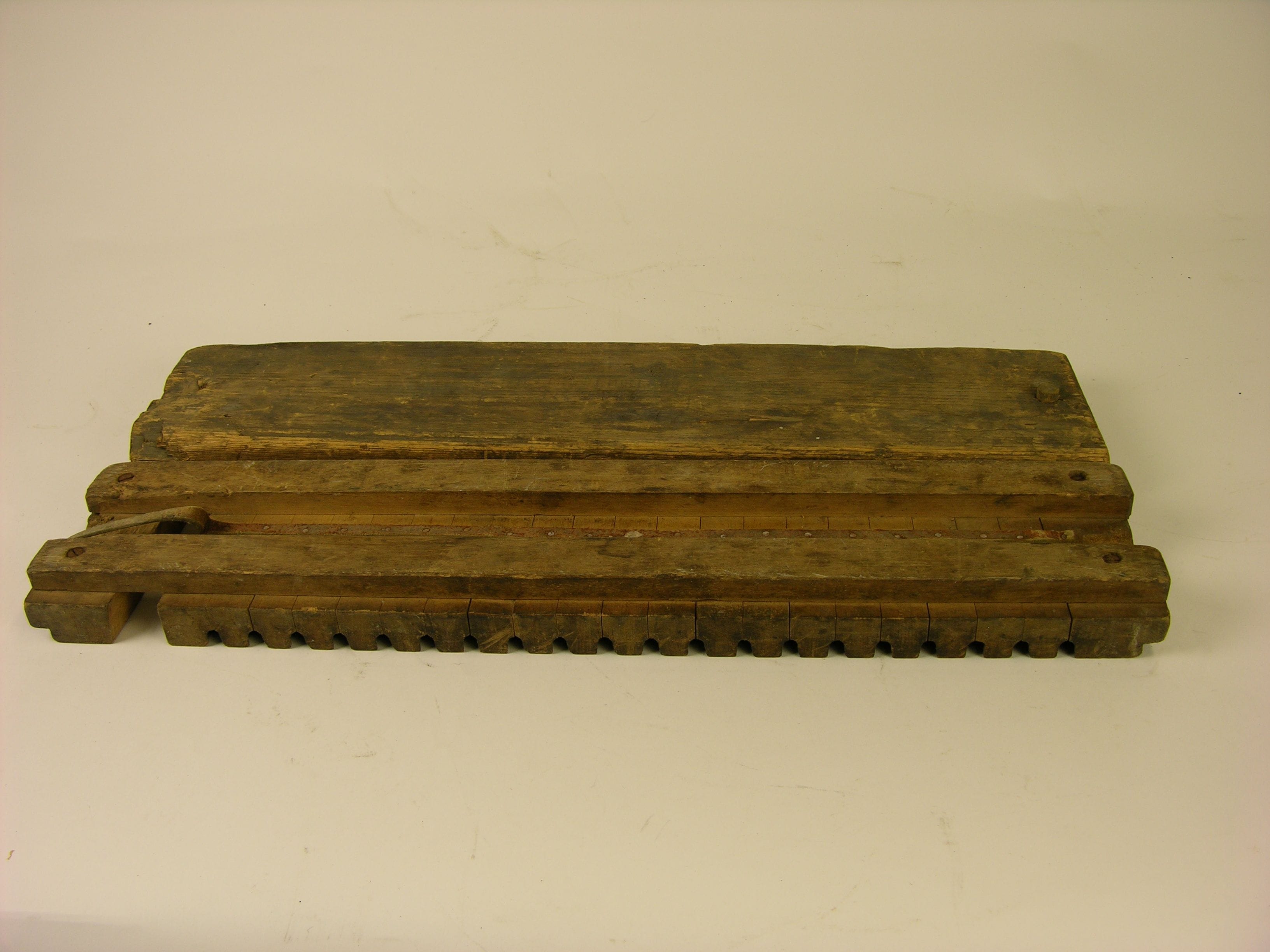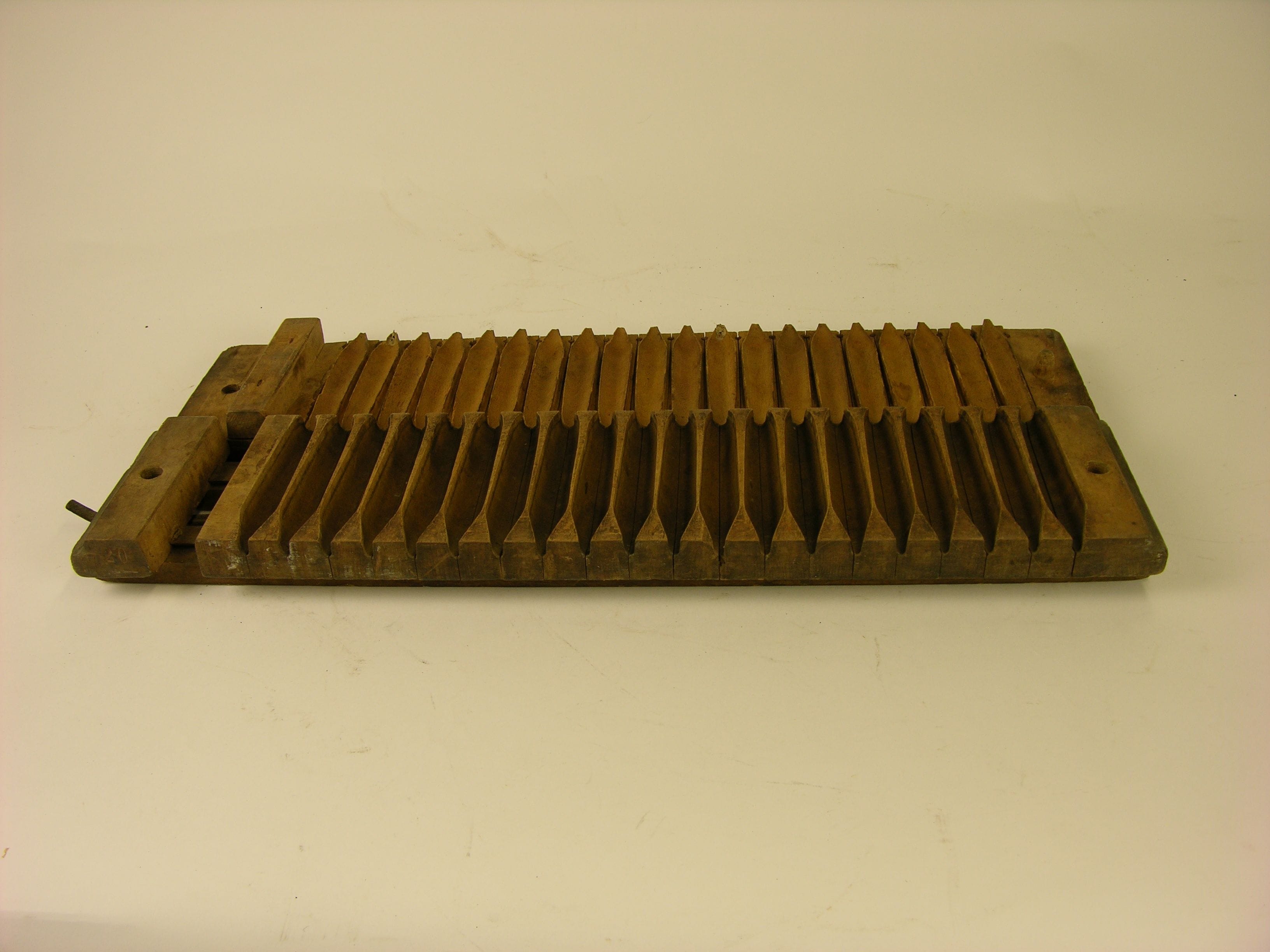 Sigarenvorm (mal), hout/leder, moeilijk leesbaar inschrift “L. Bezemer en Zn. Helmond Holland No 2413”, tweedelige houten vorm voor het vormen van sigaren, 60,5 x 13,5 x 6,5 cm, datering 1900 – 1950, in de mal bevinden zich nog sigaren.