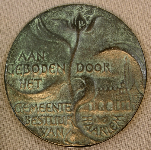 Voorzijde: op de voorgrond een bloem (een tulp) met op de achtergrond een gezicht op de stad Haarlem. Opschrift: 'AANGEBODEN DOOR HET GEMEENTEBESTUUR VAN HAARLEM'. Keerzijde: twee tulpen met daartussen het gemeentewapen van Haarlem. Opschrift Positie: voorzijde Opschrift Type: reliëfopschrift Opschrift Inhoud: "AANGEBODEN DOOR HET GEMEENTEBESTUUR VAN HAARLEM" Productie reden: erepenning van de Gemeente Haarlem