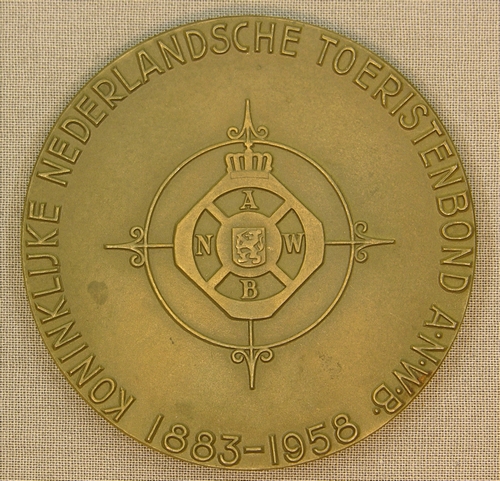 Voorzijde: vrouwelijk naakt (personificatie van de Kennis) dat haar sluier oplicht en drie vogels in vlucht voor een wereldbol. opschrift: 'SCIENTIA MUNDI ORBI PAX'. Keerzijde: windroos met het vignet van de A.N.W.B. Randschrift: 'KONINKLIJKE NEDERLANSCHE TOERISTENBOND A.N.W.B. 1883 - 1958' oorzijde: vrouwelijk naakt (personificatie van de Kennis) dat haar sluier oplicht en drie vogels in vlucht ...