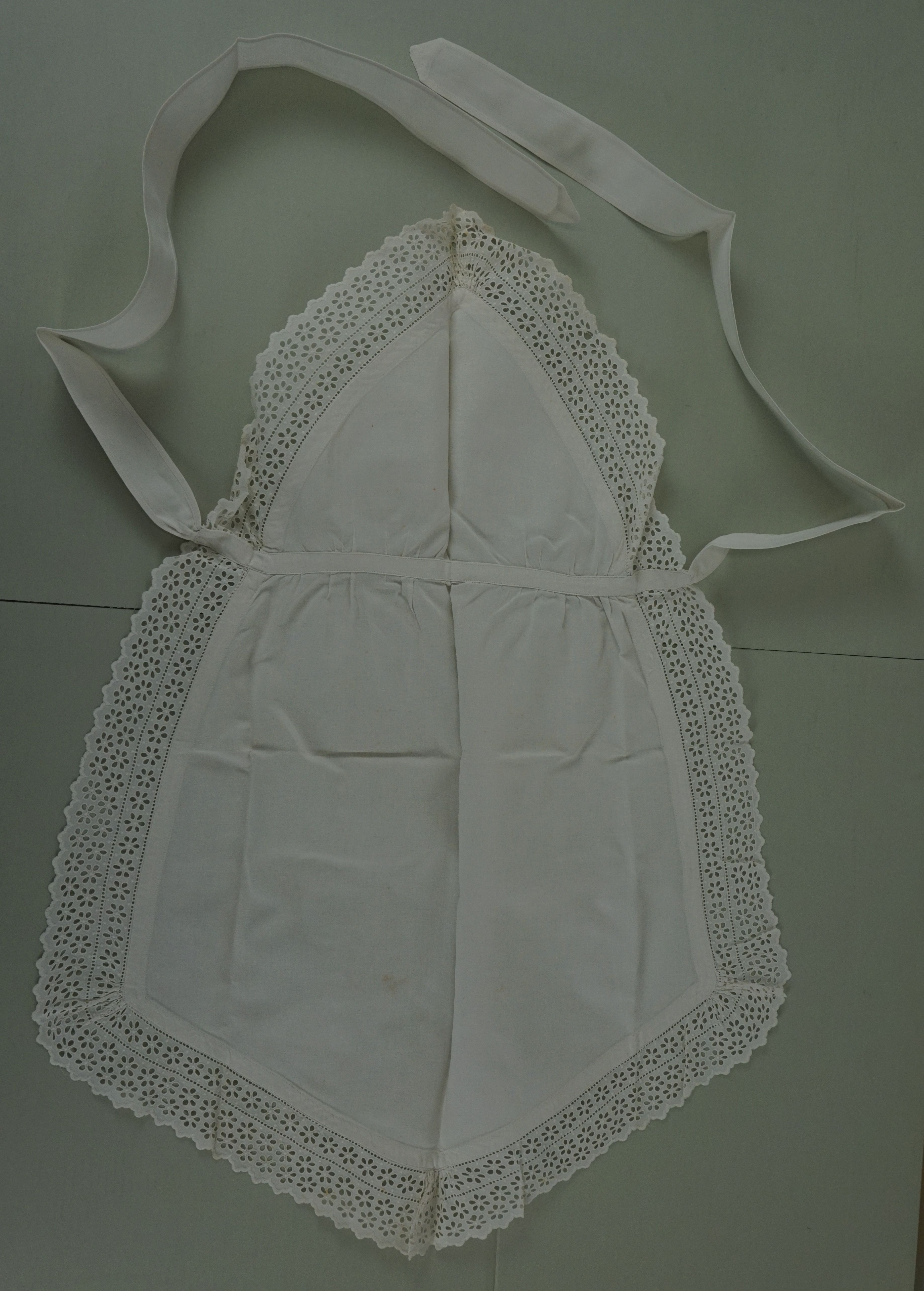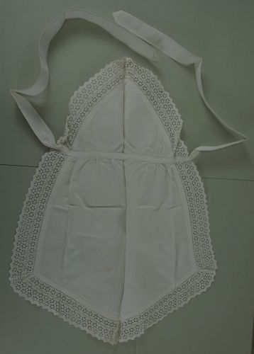 Schort, materiaal: katoen, kleur: wit, lengte 91 cm, breedte 35 cm, eenvoudige bedieningsschort, rondom afgezet met 7 cm brede broderiekant, op taillehoogte aan voorzijde bandje met daaraan 84 cm lange en 4,5 cm brede taillebanden, moet middenvoor met speld vastgezet worden, huisvlijt