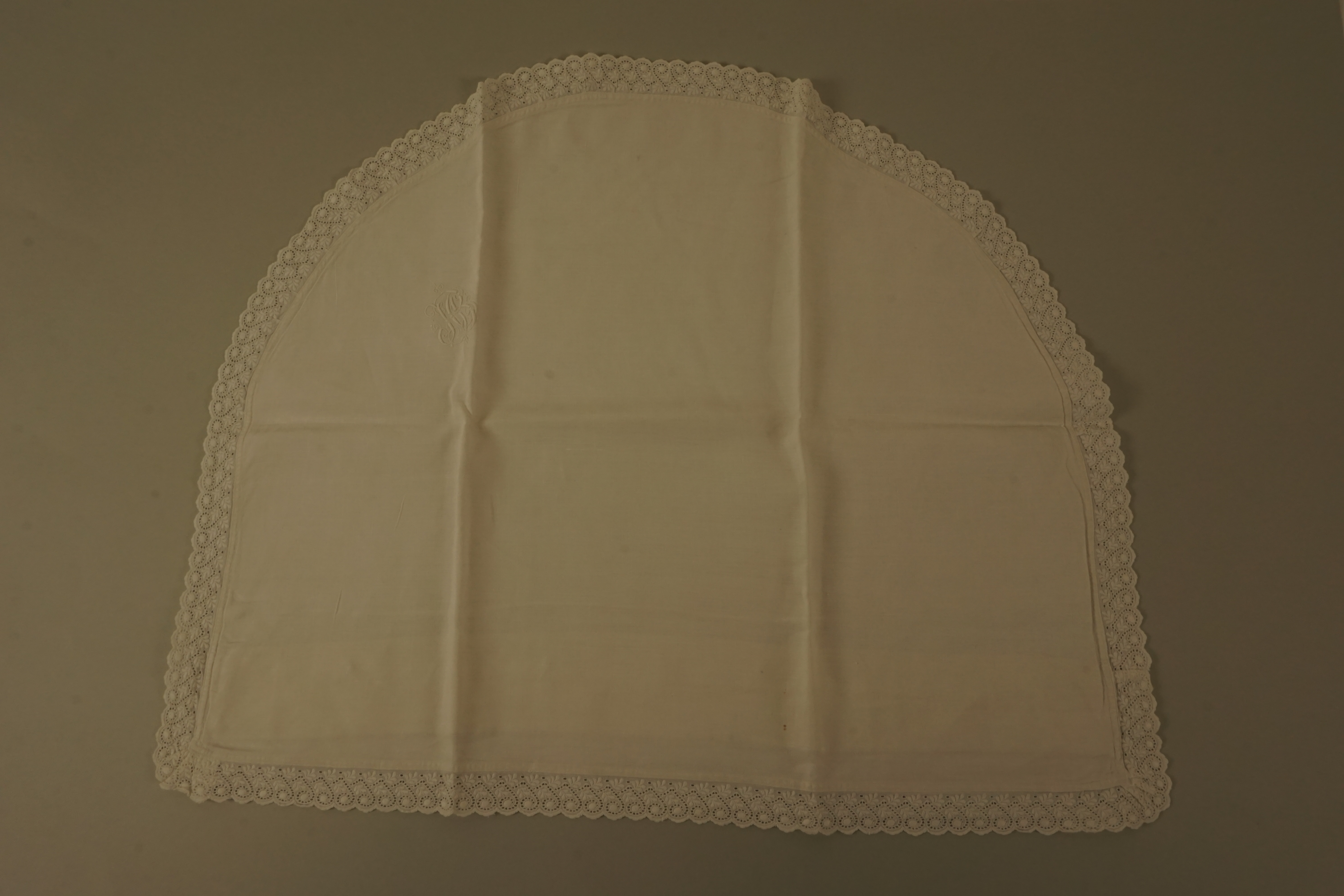 Kussensloop (kinder-), materiaal: linnen, kleur: wit, lengte 50 cm., breedte 61,5 cm., rondom 2,8 cm breed broderiekant tussen de naden genaaid, geborduurd monogram JHB (staat voor Houben-Brouwer), vier handgemaakte knoopsgaten, wasmerkje 12 ingeborduurd, geen knopen, hoort bij 2007.02.179, ,2007.02.180 en 2007.02.182