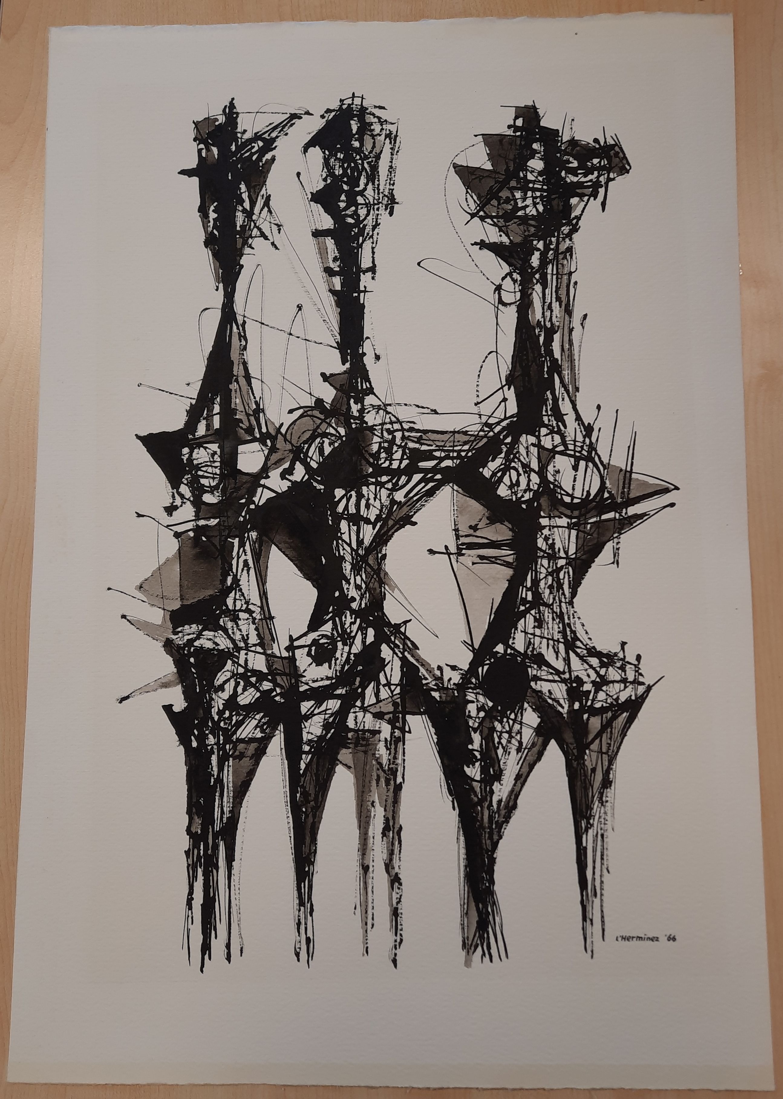 Drie staande figuren - 1966, gewassen Oostindische inkt/papier, 500 x 330 mm, gesigneerd en gedateerd r.o.: l'Herminez '66