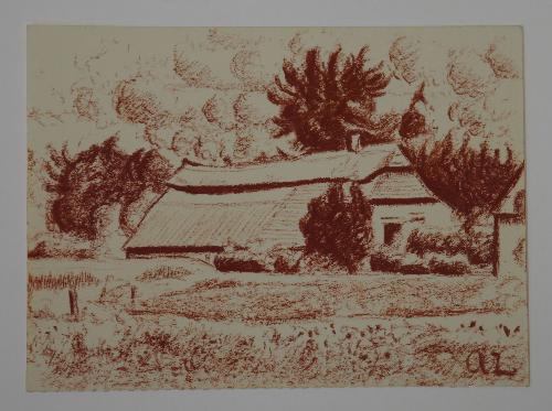 gemonogrameerd r.o.: A L geannoteerd, gedateerd en gesigneerd op achterzijde: Boerenhuis onder Holthees (Maashees. N-Br.) 1944 A van Leggelo In passe-partout