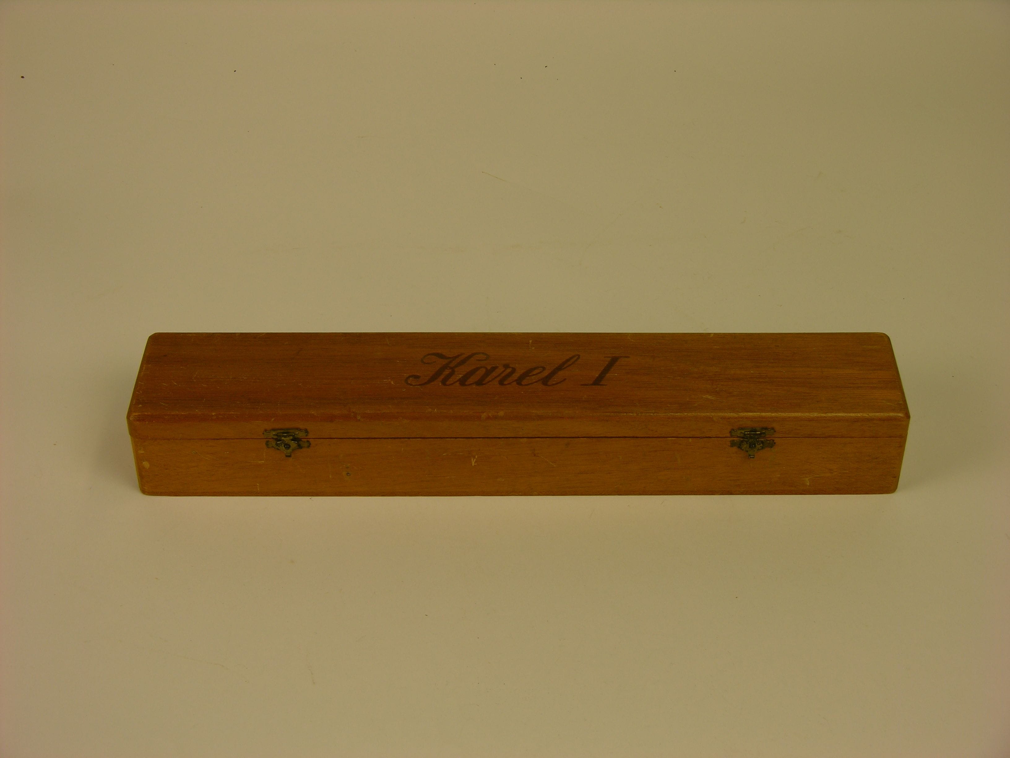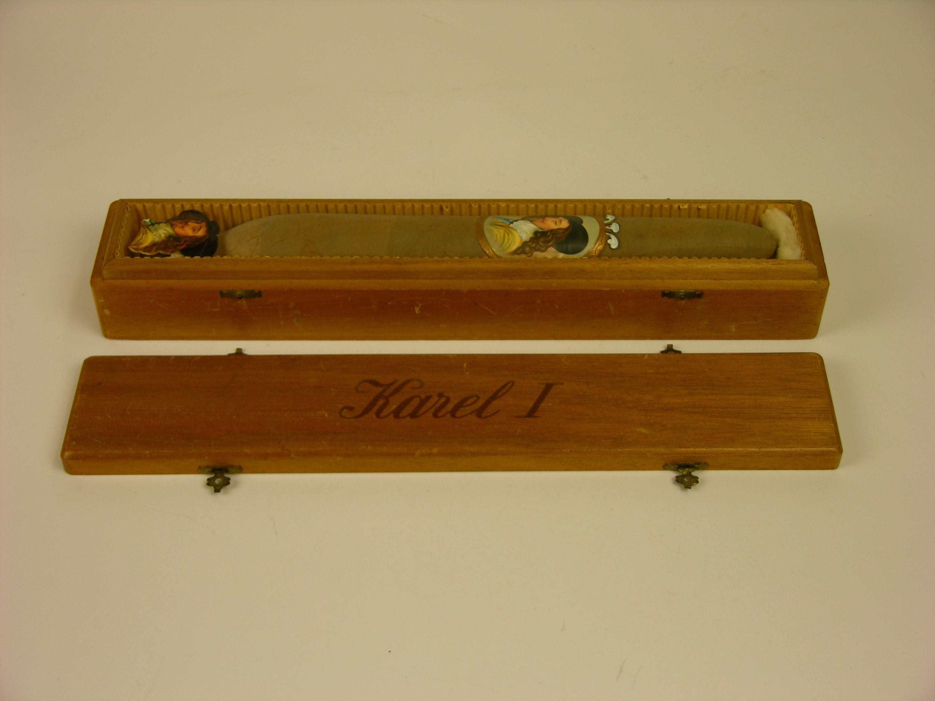 Sigarenkistje 'Karel I sigaar' - 2e t/m 3e kwart van de 20e eeuw, materiaal: hout, papier en tabak, afmetingen: 5,5 x 7,5 x 41 cm, sigarenkistje waarin zich een sigaar met bandje van het merk Karel I bevindt, bandje in chromolithodruk, vier sluitscharnieren aan kistje.