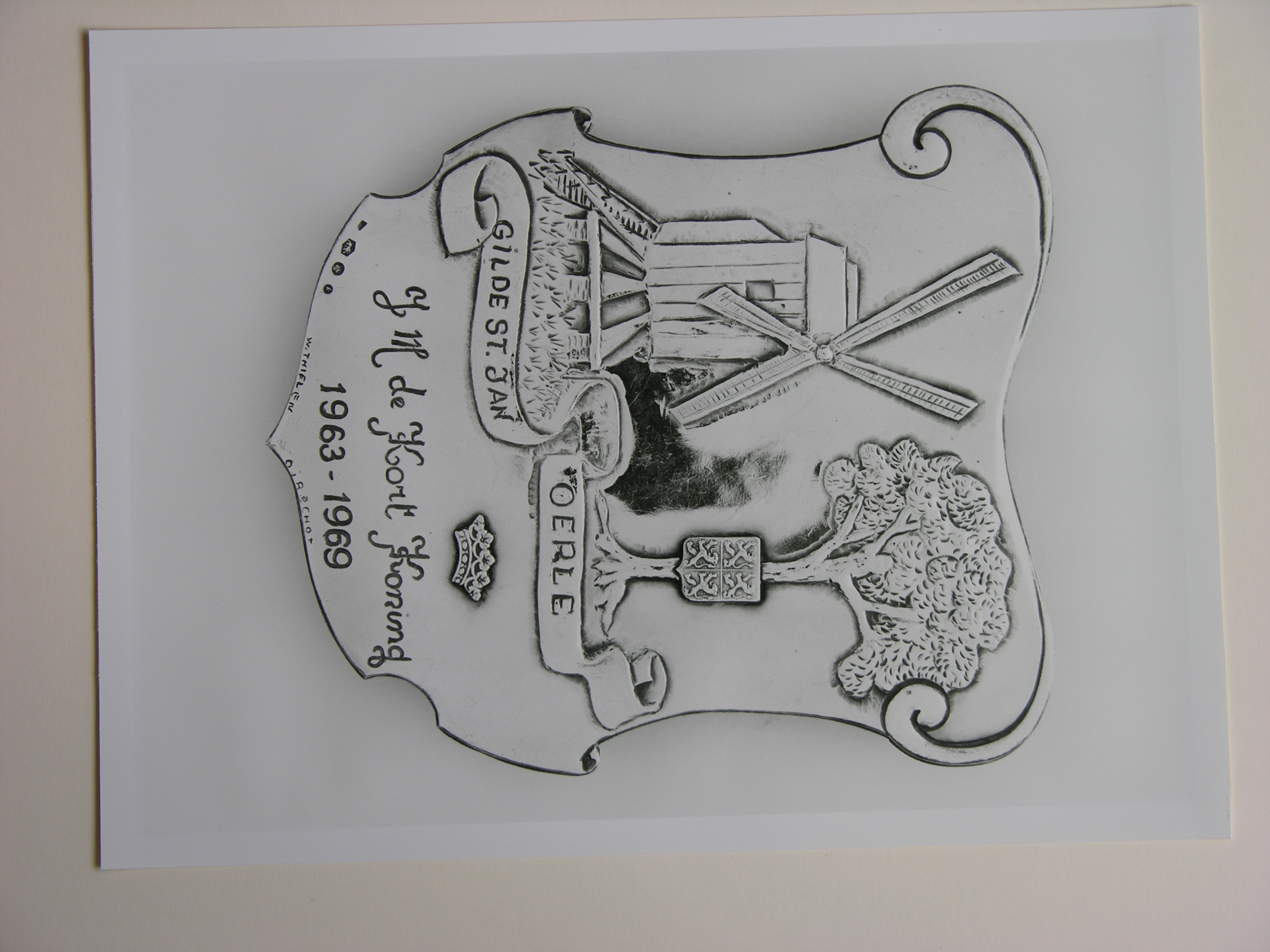 Koningsschild Sint-Jansgilde Oerle, 1963-1969 meesterteken: W.A.Thielen Gilze/Oirschot tekst: GILDE ST.JAN / OERLE / J.M. de Kort Koning/1963-1969. Voorstelling: boven de tekst staat links een standaardmolen in vreugdestand, rechts ervan een eikeboom waaraan een gevierendeeld wapen met in elk kwartier een naar rechts gewende leeuw (=Oerle). Onder de tekstbanderole een opgelegd kroontje. zie voorts tentoonstellingscatalogus, cat.nr ...