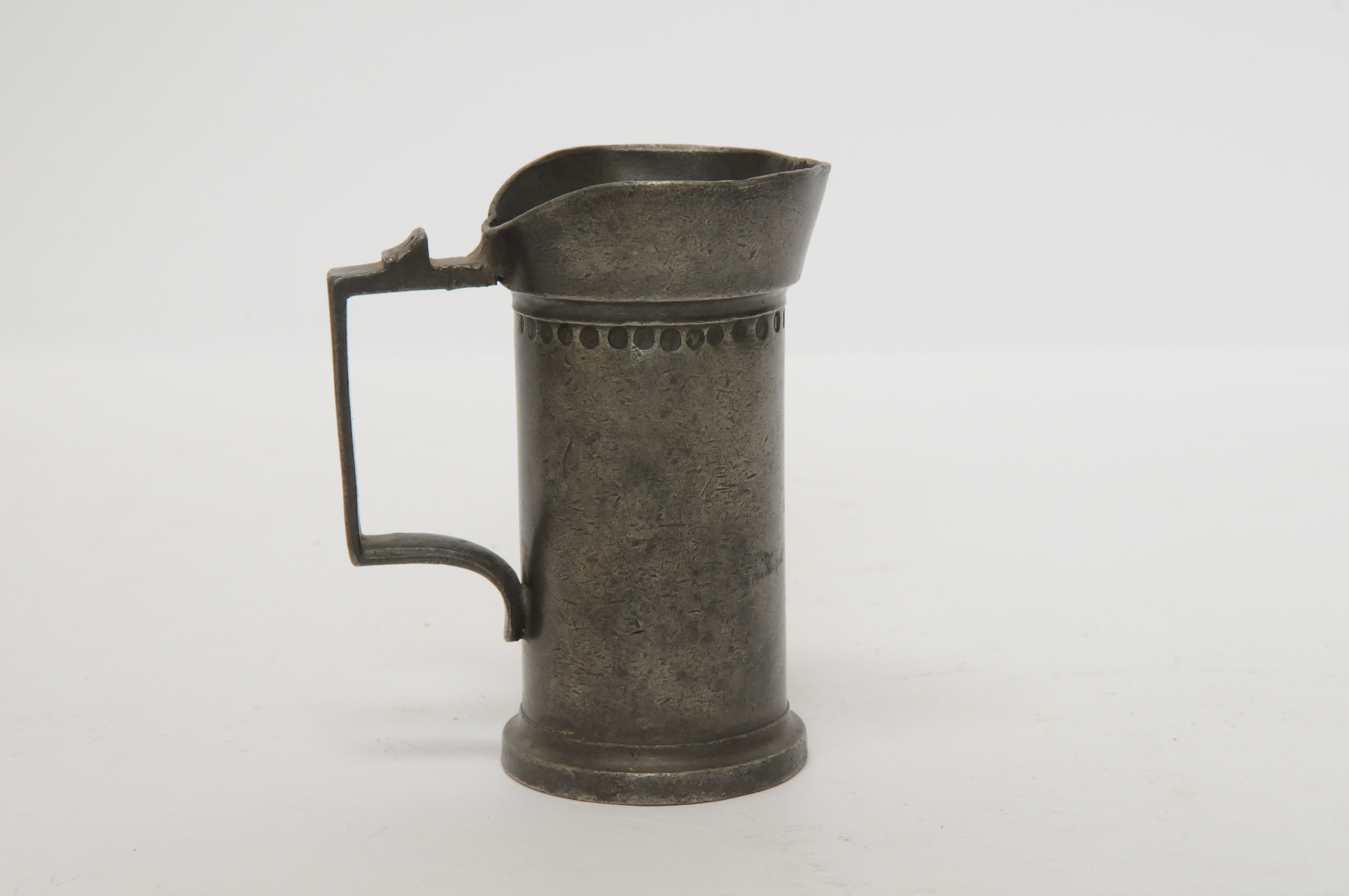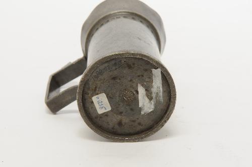 Tinnen maatkan met handgreep, inhoud 2 deciliter, gemerkt op onderkant: Van Leeuwen Van Camp Eindhoven gekeurd: f-V=1894/1895 - 1954/1955; A-B=1963/1964 - 1965/1966 ; 2=Breda