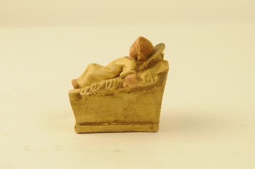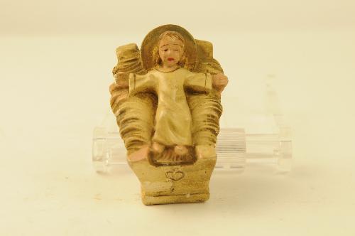 Kindje Jezus in kribbe van beschilderd gips. Gemerkt op achterzijde kribbe: AB (ineen) K.S. 18.