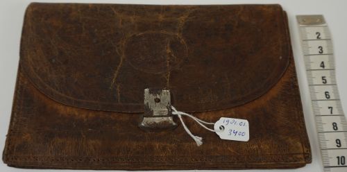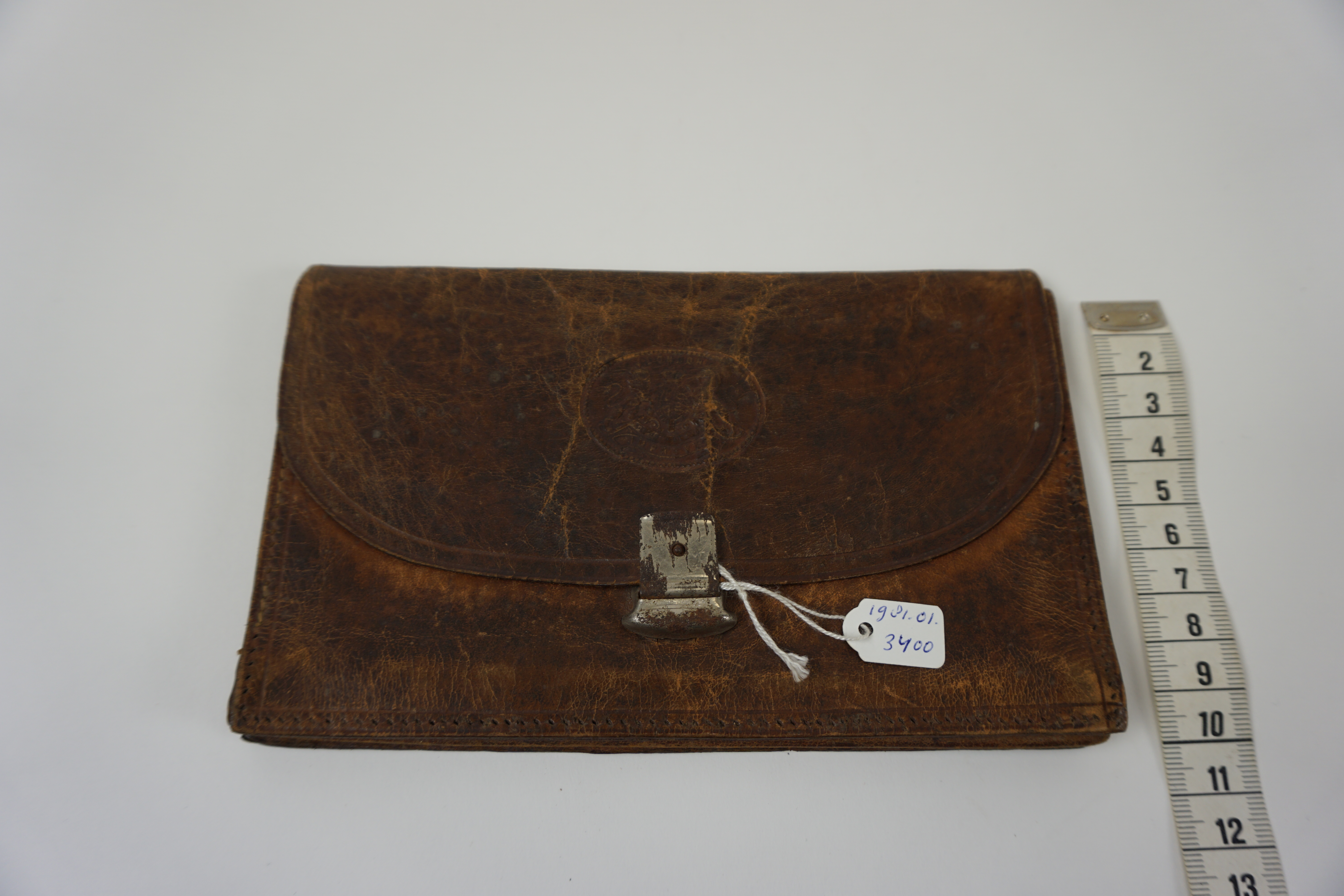 Geldbeurs (huishoudportemonnaie)- 1e t/m 3e kwart van de 20e eeuw, materiaal: leder en metaal, afmetingen: 10,5 x 17,5 x 1 cm, een platte lederen huishoudbeurs met een metalen sluitertje, met in het leder een ovalen blindstempel met twee staande leeuwenfiguurtjes en het opschrift: 'LONDON .....IMPROVE'