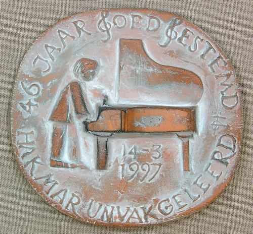 Penning 46 jaar Goed Gestemd HAK MAR UN VAK GELEERD - 1997, keramiek/beschilderd, diam. 80 mm, dikte 15 mm, opschrift: '14-3-1997 46 JAAR (g-sleutel)OED (g-sleutel)ESTEMD HAK MAR UN VAK GELEERD 14-3-1997', gemonogrammeerd: 'H + f-sleutel' Van deze penning zijn twee bronzen en vijftig keramische exemplaren vervaardigd