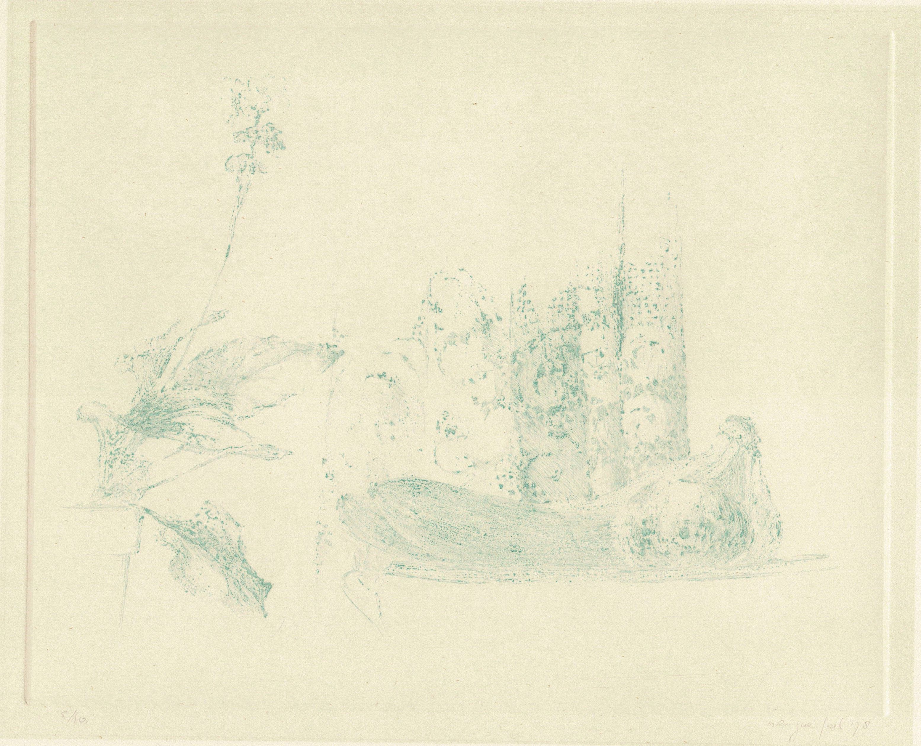 ets in blauw/papier (5/10), onder plaat in potlood: 5/10 marijke fast '78 inv.nr sociale dienst: GW 1964