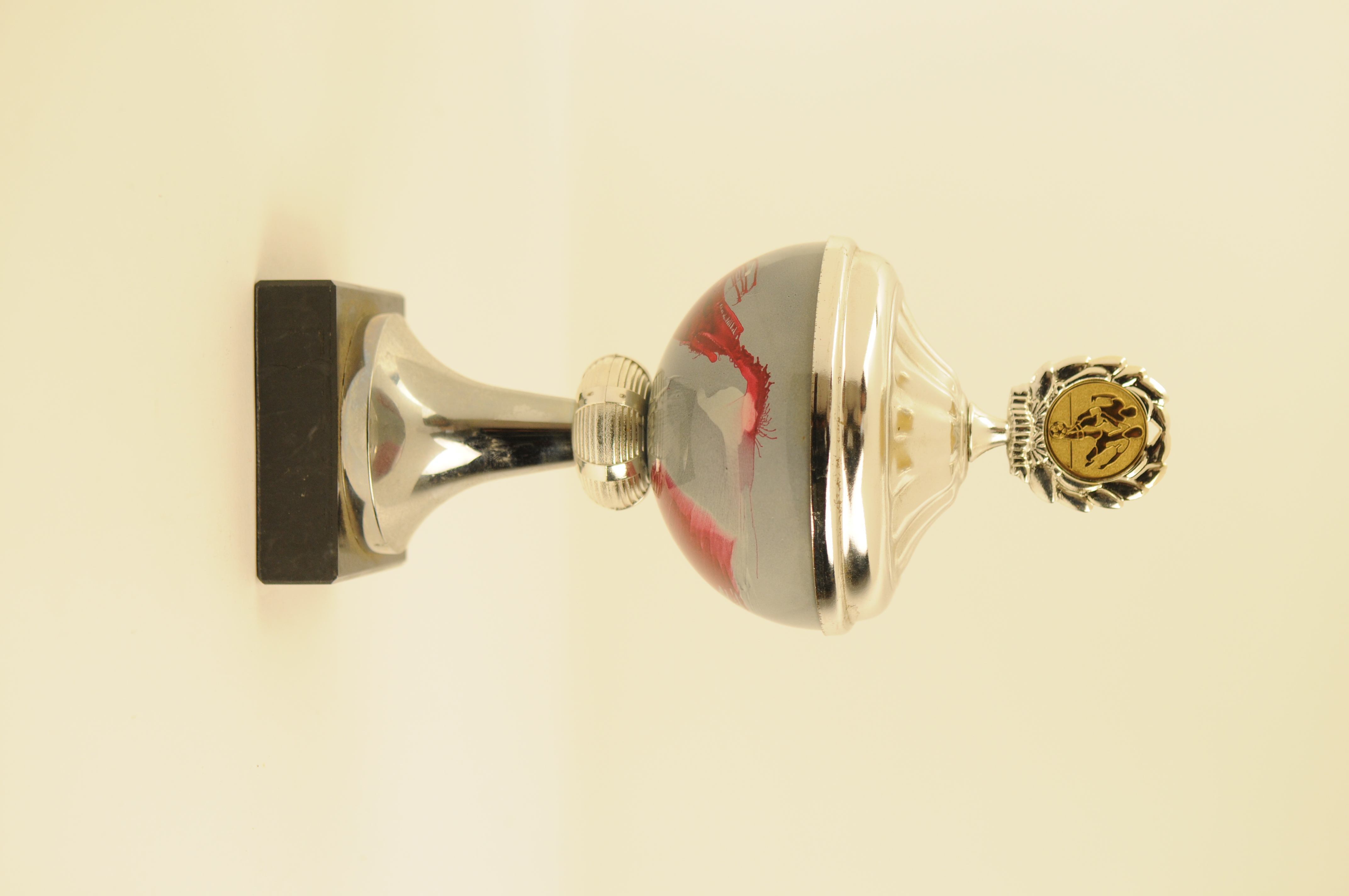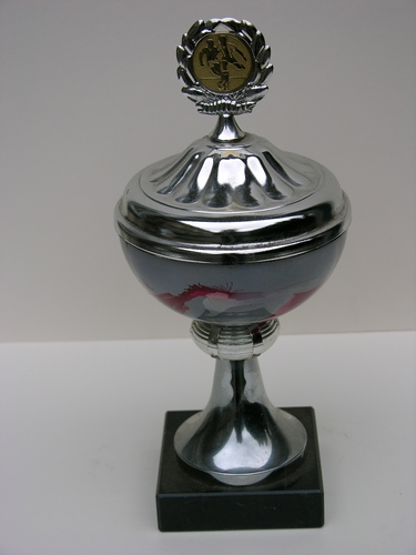 Prijsbeker voetbalvereniging RKSV, met (vaste) deksel bekroond door medaillon, waarop twee voetballers zijn afgebeeld omgeven door een lauwerkrans. Opm: tekstschildje voorzijde is verwijderd Prijsbeker voetbalvereniging RKSV, met (vaste) deksel bekroond door medaillon, waarop twee voetballers zijn afgebeeld omgeven door een lauwerkrans. Materiaal: voetstuk marmer(kunst)steen, beker: metaal, deels verchroomd en geemailleerd en plastic, hoogte 22,5 cm, diameter ...