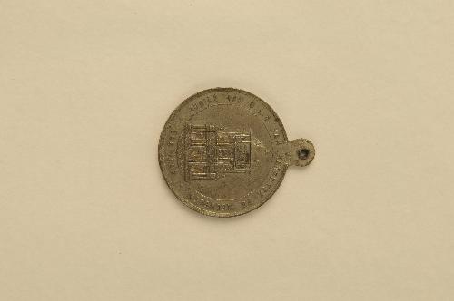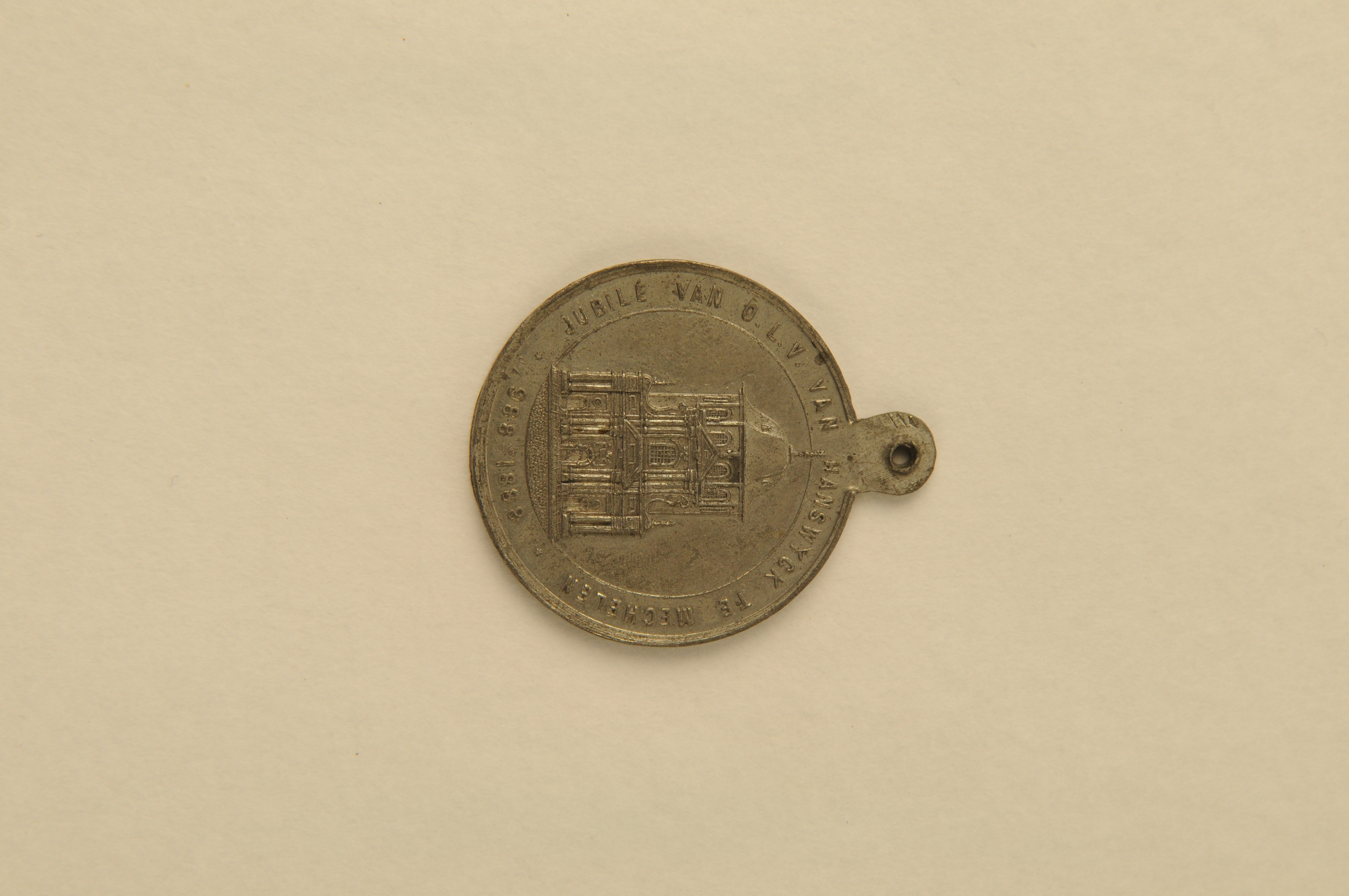 Religieuze medaille/draagpenning O.L.V. van Hanswyck – 1888, metaal, verzilverd, ronde draagmedaille met op vz. reliëfafbeelding van het beeld van O.L.V. van Hanswyck onder een baldakijn met randschrift ‘MIRAKULEUS BEELD VAN O.L.V. VAN HANSWYCK’, op kz. reliëfafbeelding van de westelijke facade van kerk van van Hanswyck te Mechelen met randschrift ‘JUBILE VAN O.L.V. VAN HANSWYCK TE ...