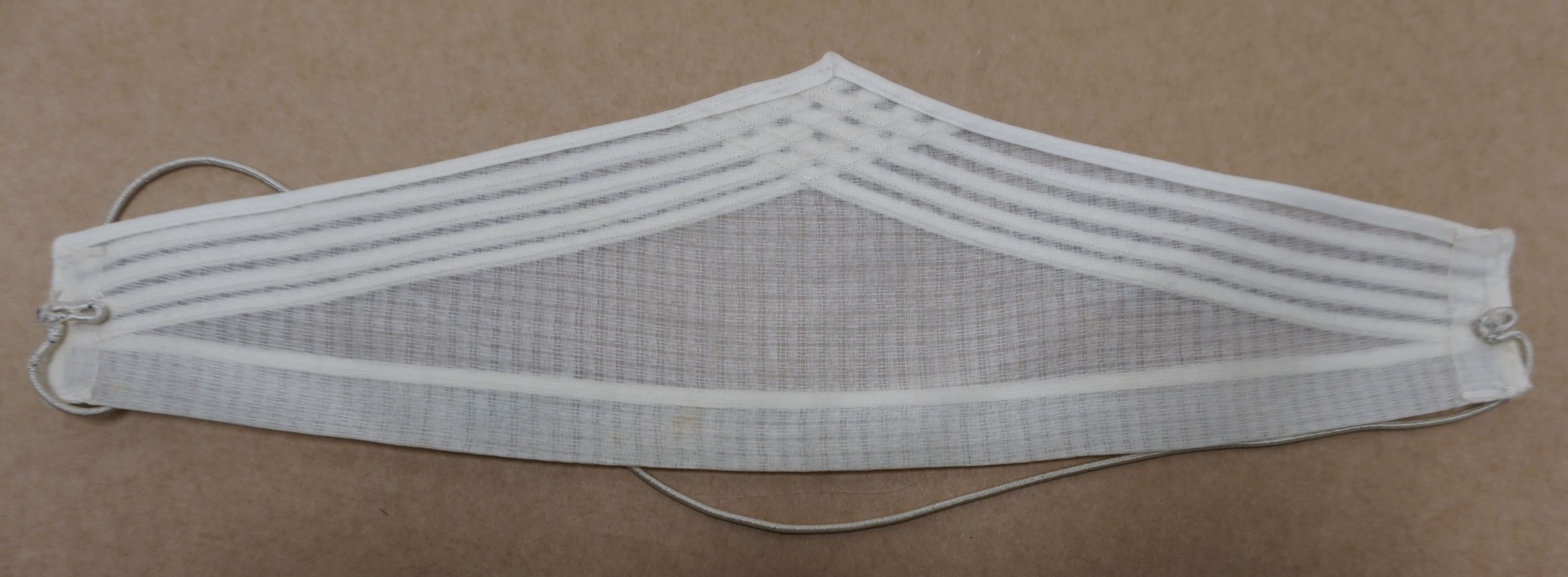 Haarband voor dienstbode, materiaal: batist, kleur: wit, lengte 29 cm, hoogte 8,5 cm, wit geweven batist, rondom omgezoomd met smalle band, vier banden opgestikt, in punt verwerkt, elastiek verbonden, geen wasmerkje, confectie