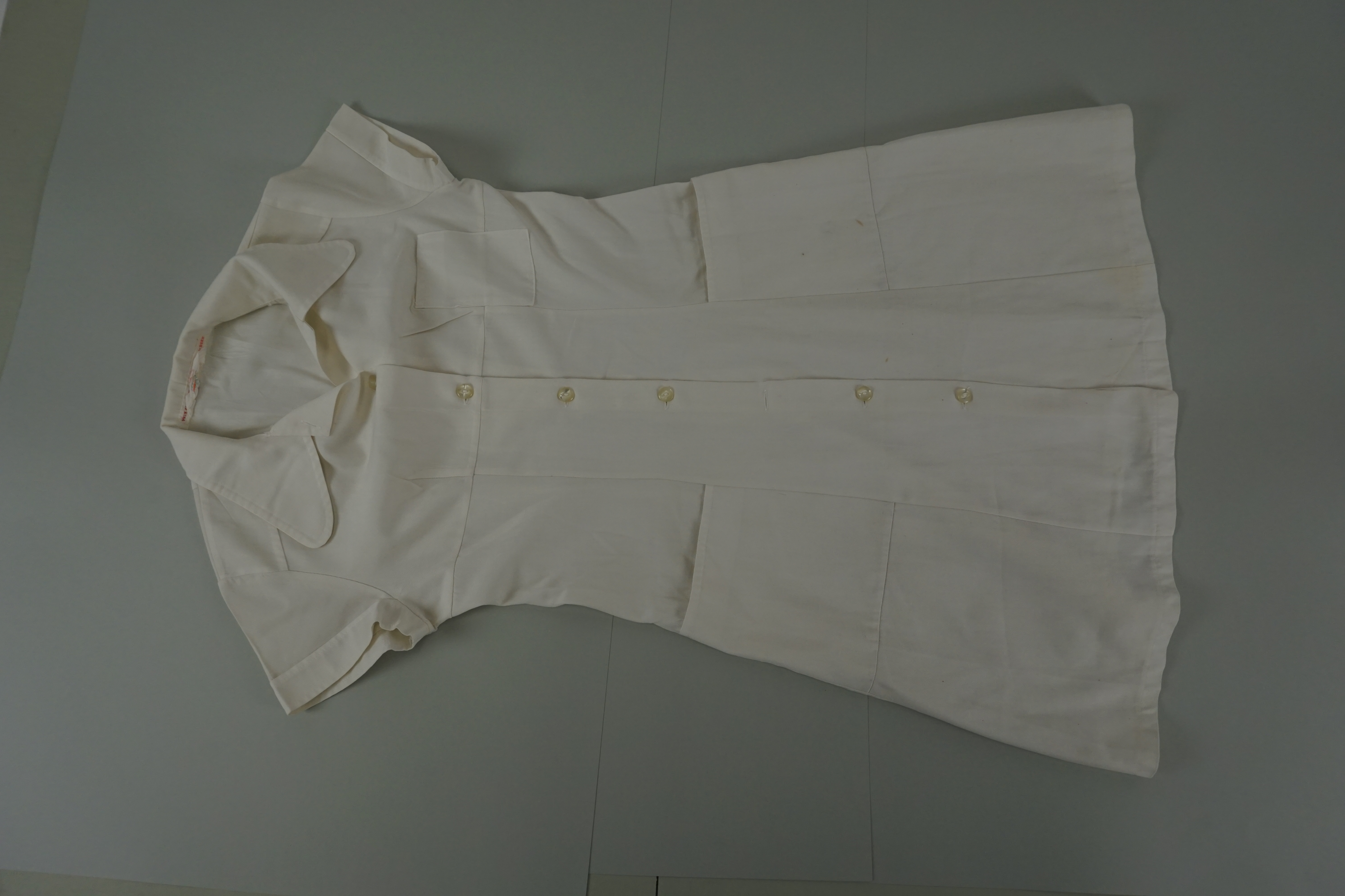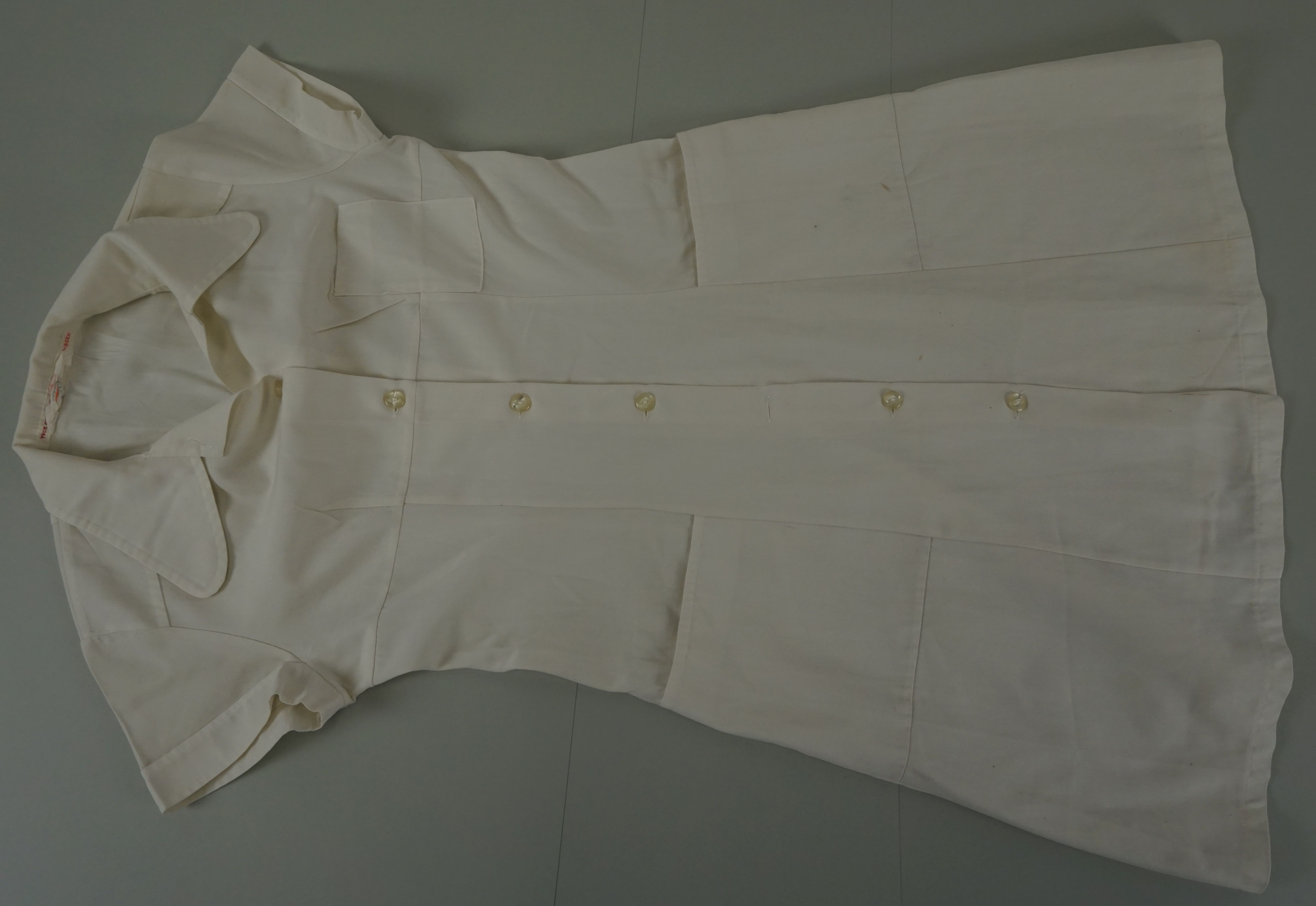 Verpleegstersjurk, materiaal: menging, kleur; wit, lengte 95 cm, breedte 48 cm, doorknoopjurk met kraag, korte mouw, borstak, twee zakken op de rok, kunststof knopen, eiket: 'Yvonne Cornelissen z.v. Kalorama Beek', merketiket: 'Gété made in Belgium'