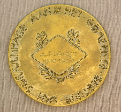 vz. ommuurde stad 's-Gravenhage waarin personificatie stad met schild en palmtak UW ARBEID SCHONKT GY 'S-GRAVENHAGE. kz. A.P. Guijt 1907-1940 in ruit op palmtak AAN HET GEMEENTE-BESTUUR VAN 'S-GRAVENHAGE op naam gesteld Opschrift Positie: voorzijde Opschrift Positie: keerzijde Opschrift Type: reliëfopschrift Opschrift Type: dedicatie Opschrift Inhoud: UW ARBEID SCHONKT GY 'S-GRAVENHAGE Opschrift Inhoud: AAN HET GEMEENTE-BESTUUR VAN 'S-GRAVENHAGE Opschrift Inhoud: A.P. Guijt 1907-1940