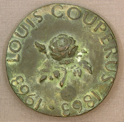 Voorzijde: portret en profil n.r. van de Haagse schrijver/dichter Louis (Marie, Anne) Couperus op jongere leeftijd. Keerzijde: in het midden rozentak met bloem. Opschrift: 'LOUIS COUPERUS 1863-1963' Voorzijde: portret en profil n.r. van de Haagse schrijver/dichter Louis Couperus op jongere leeftijd. Keerzijde: in het midden rozentak met bloem. Opschrift: 'LOUIS COUPERUS 1863-1963' Opschrift Positie: keerzijde Opschrift Type: randschrift Opschrift ...