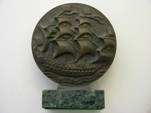 'De Zeven Provinciën' - 1960, brons en verde fraye, diameter 107 mm, vz.: afbeelding van het 17e eeuws driemastig vlaggeschip van de Hollandse vloot met volle zeilen en vlaggen/wimpels op alle masten. Opschrift: onderaan op banderol 'DE ZEVEN PROVINCIËN', kz.: opschrift: 'OPENING HOOFDKANTOOR LANGE VOORHOUT 'S-GRAVENHAGE 1960 ASSURANTIEMAATSCHAPPIJ DE ZEVEN PROVINCIËN N.V.' Opschrift Intepretatie: Het vlaggeschip ...