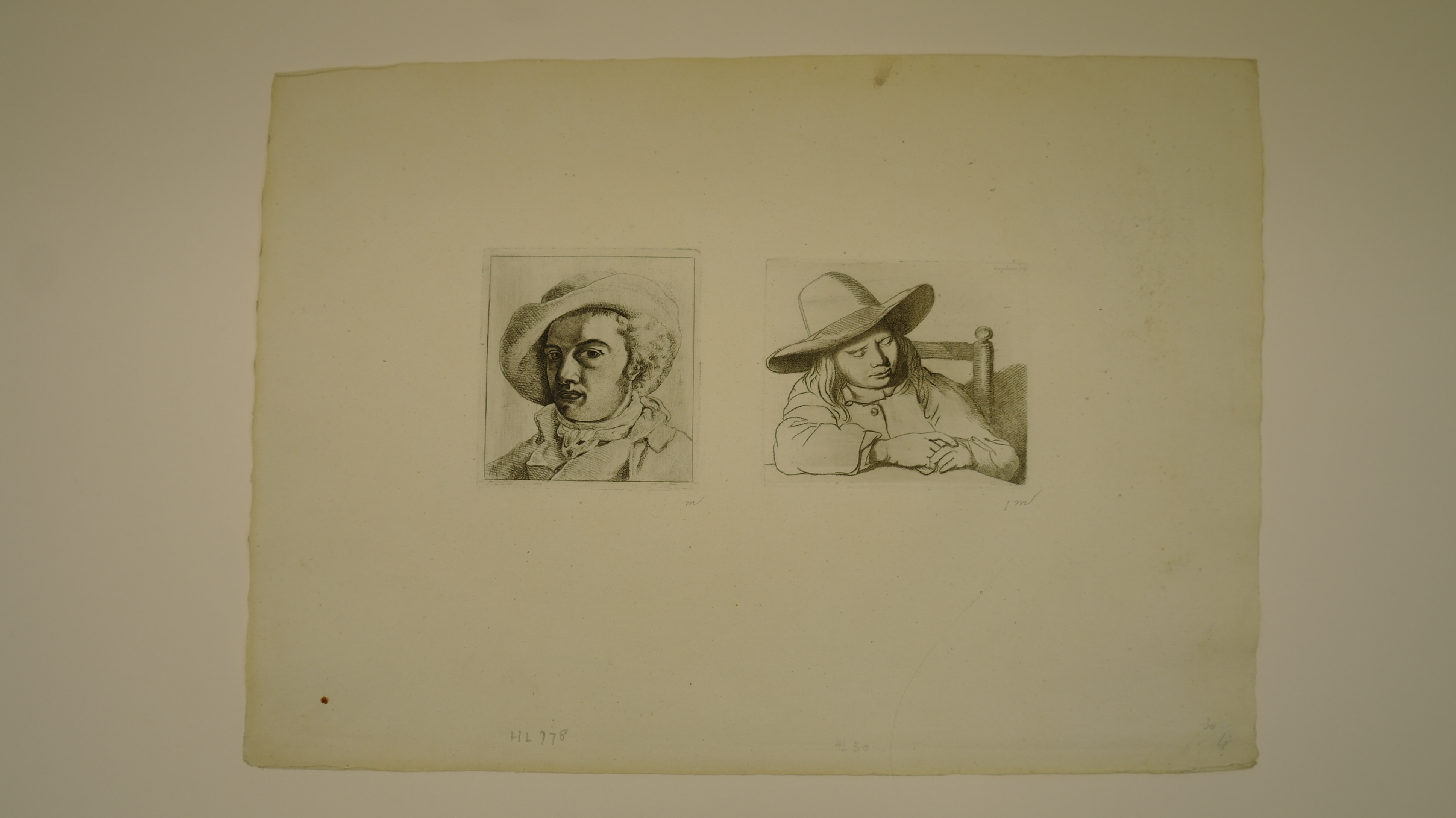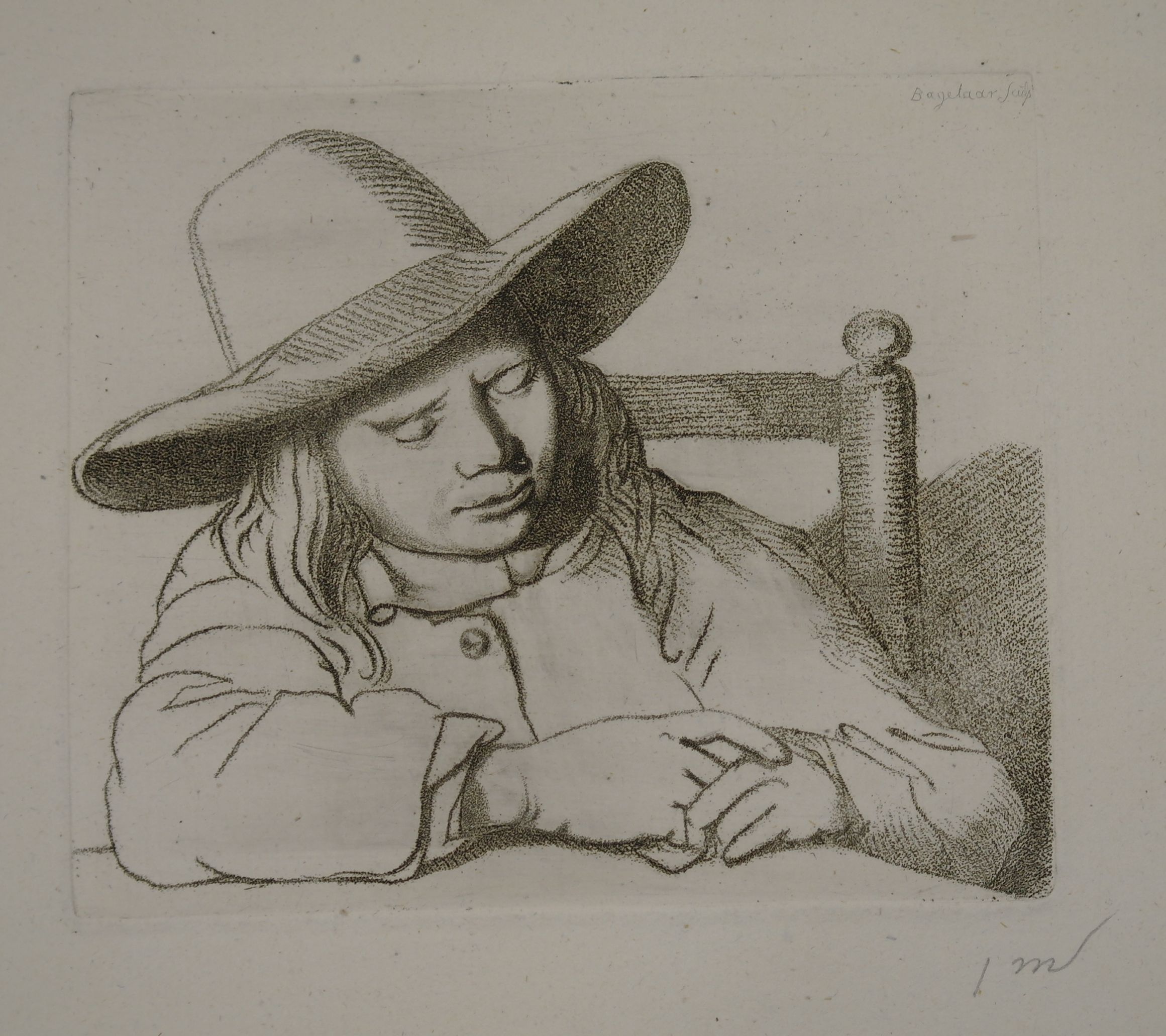 Naar Jan Steen. Een jonge man, leunend op de hoek van een tafel, slapend met hoed op het hoofd. gesigneerd in potlood r.b.: Bagelaar sculp. H&L (T. Hippert en J. Linnig) Le Peintre-graveur hollandais et belge du 19me siècle, 1879) nr. 30 op a.z. stempel: '49 samen met 1999.10.230 op één vel