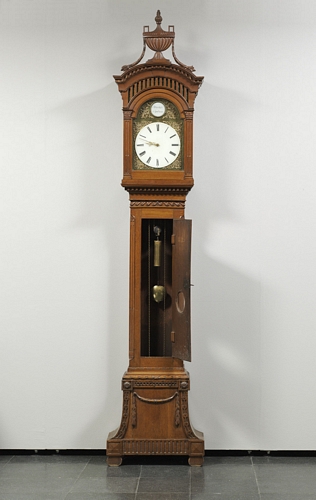 Staand eendaags uurwerk – ca. 1800, materiaal: hout, ijzer, messing en glas, in eikenhouten Louis XVI – kast met als bekroning een kantharos en glazen wijzerplaat en glazen medaillon met geschilderde tekst: ‘A van Bussel à Eijndhoven’, afmetingen 273 x 59,5 x 20,5 cm