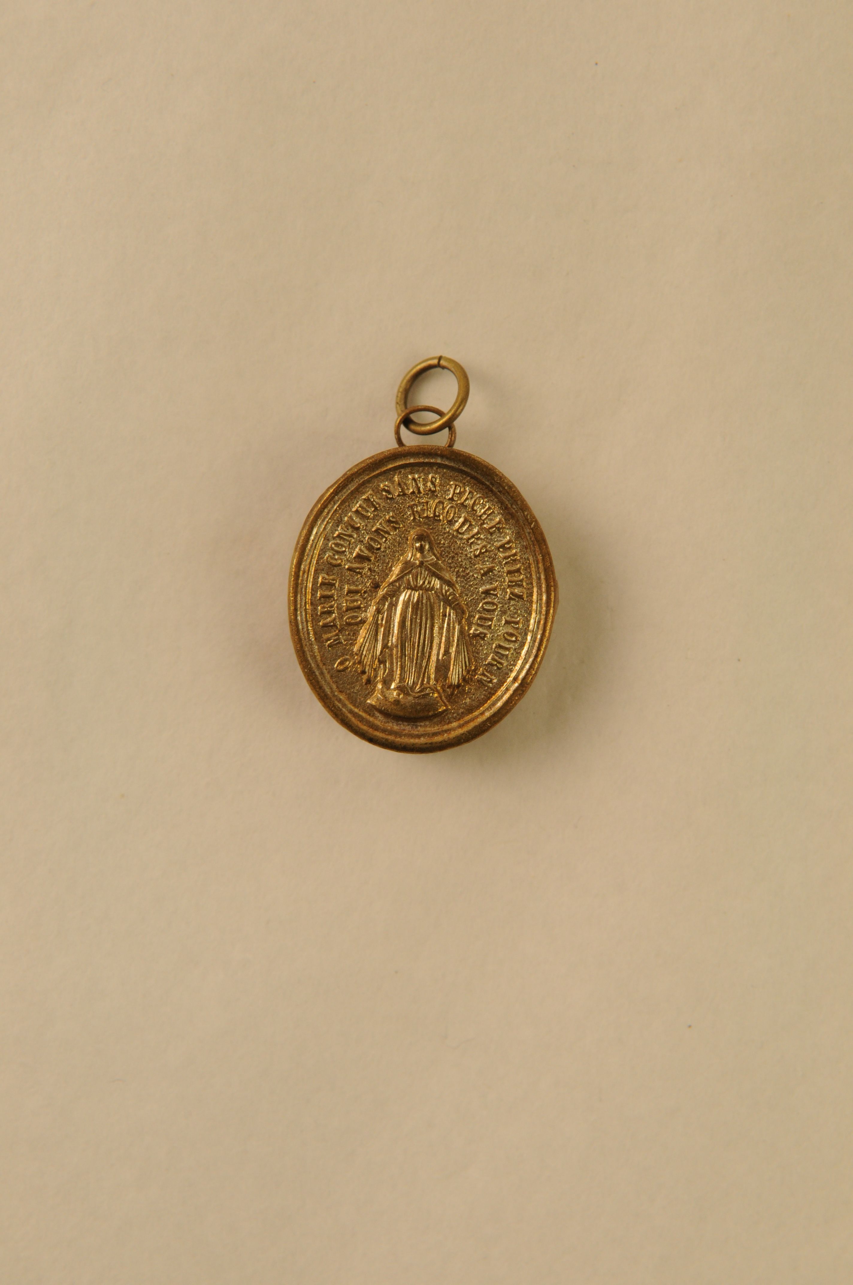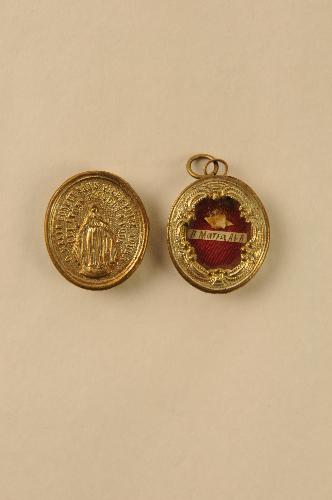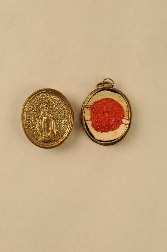 Relikwiehanger, materiaal: glas en messing (verzilverd), ovalen cylindrische relikwiehanger met ophangoog en draagringetje, in de cylinder op rood katoen een relikwie van de Z. Maria Ab A., in inkt op etiketje onder relikwie ‘B. Maria Ab A’, hanger voorzijde versierd met lijstwerk, achterzijde afb. H. Maagd en randschrift ‘O MARIE CONCUE SANS PECHE PRIEZ POUR ...