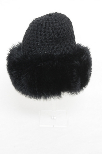 Damesmuts, materiaal imitatiebont, gehaakte wol en leder, kleur zwart, lengte 26 cm, breedte 38, cm, 7 cm lederen blauwe binnenrand waaraan imitatiebont bevestigd is, muts is 55% wol en 45% polyacryl. Vermoedelijk uit de jaren '70 van de 20e eeuw Damesmuts - omstreeks jaren 1970, materiaal imitatiebont, gehaakte wol en leder, kleur zwart, lengte 26 cm, ...