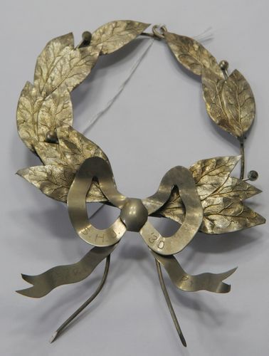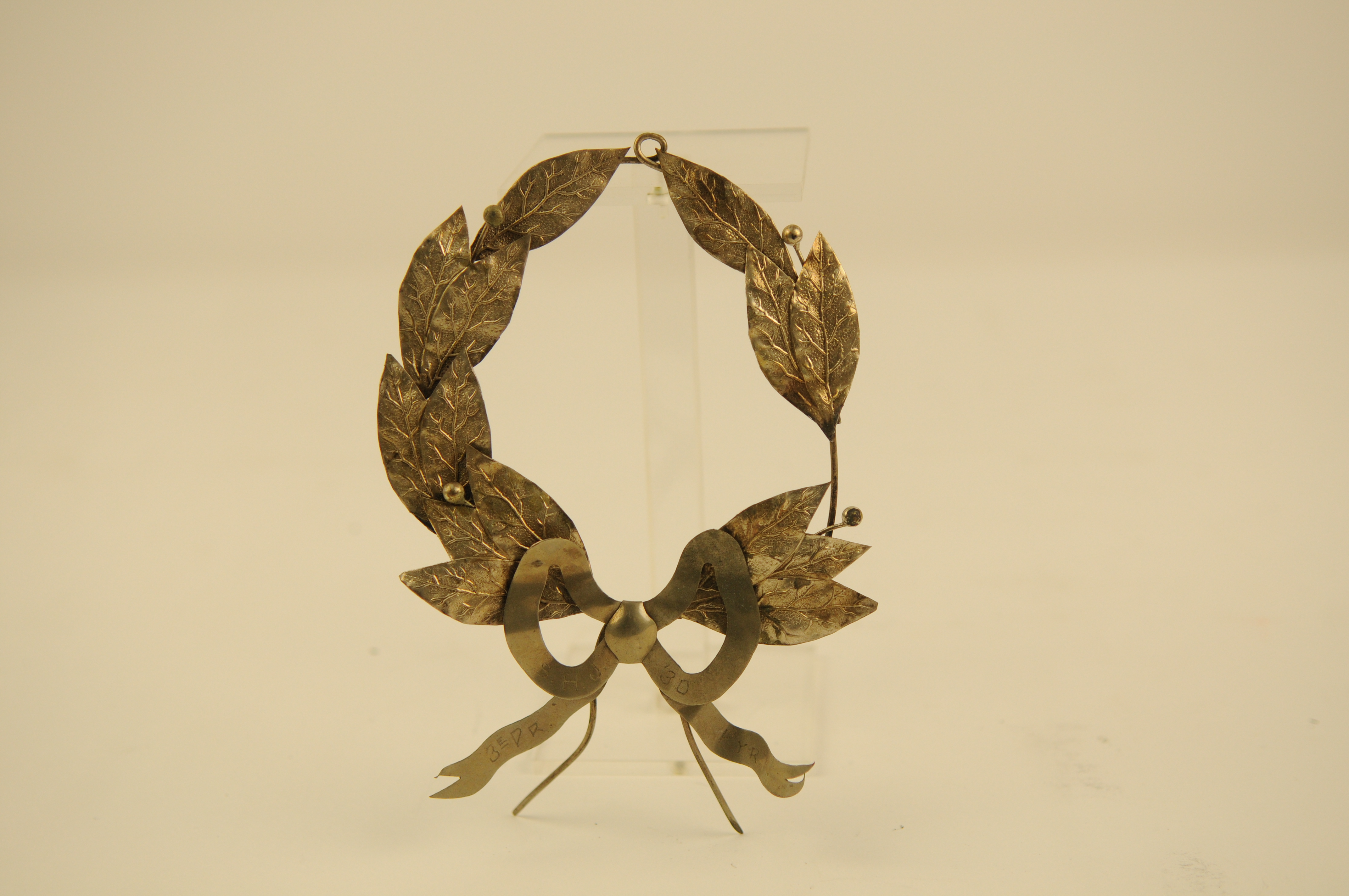 Lauwerkrans - 1930, materiaal: metaal, verzilverd, afmetingen: 16,5 x 11 x 1 cm, 14-bladige lauwerkrans met vier vruchten, symmetrisch uitgewerkt banderole-lint met de inscriptie: ‘S.H.J. ’30 3E PR. PYR.’
