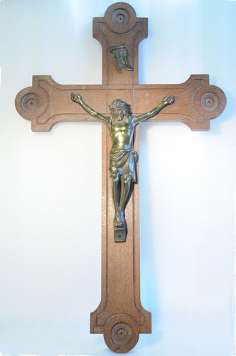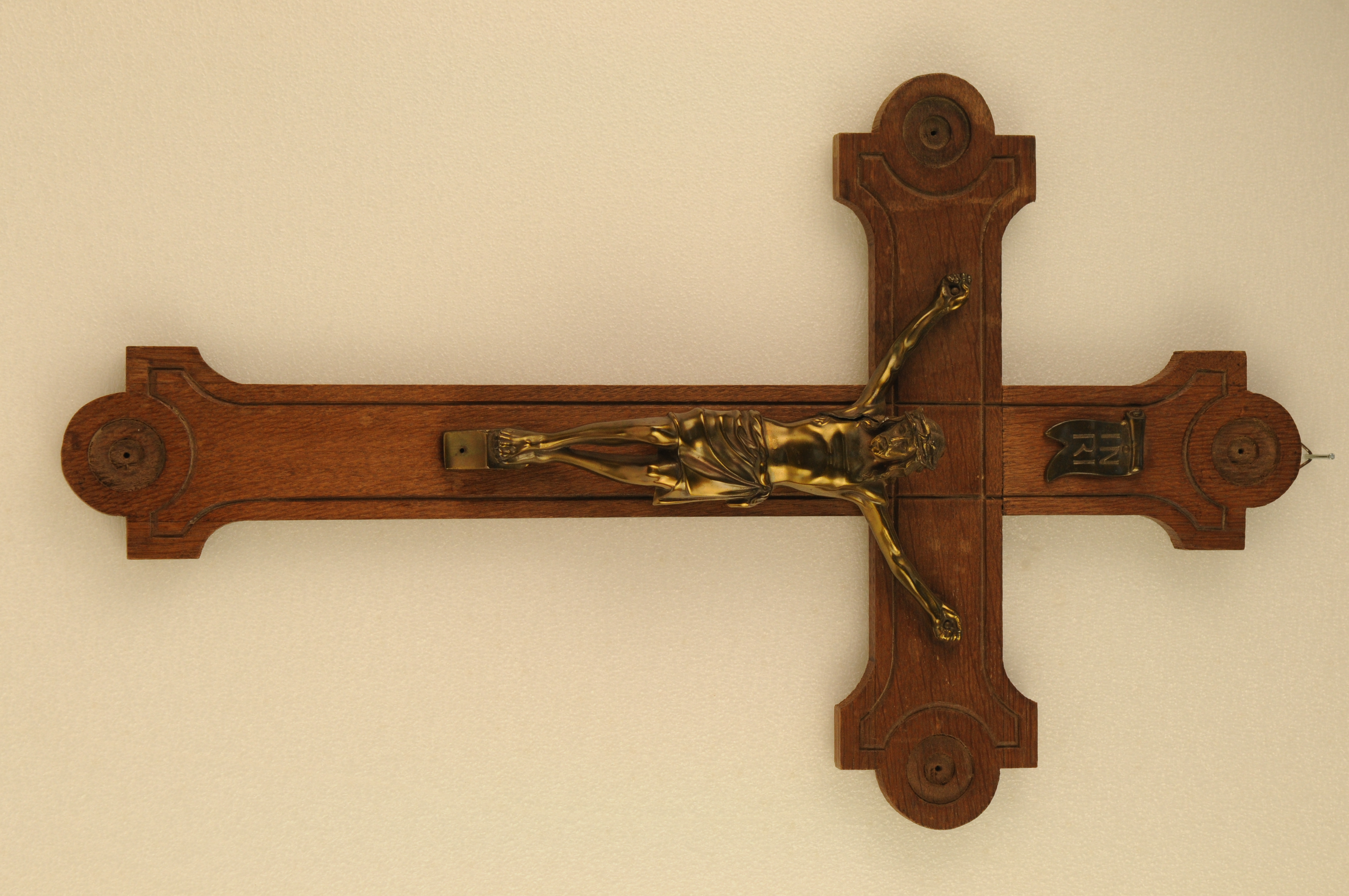 Hangkruis. De kruisarmen eindigen verbredend, rechthoekig, gecombineerd met cirkelvorm; er loopt een decoratieve ingekerfde /verdiept gestoken lijn over het kruis; INRI-plaatje is een combinatie van een vaandel en banderol.