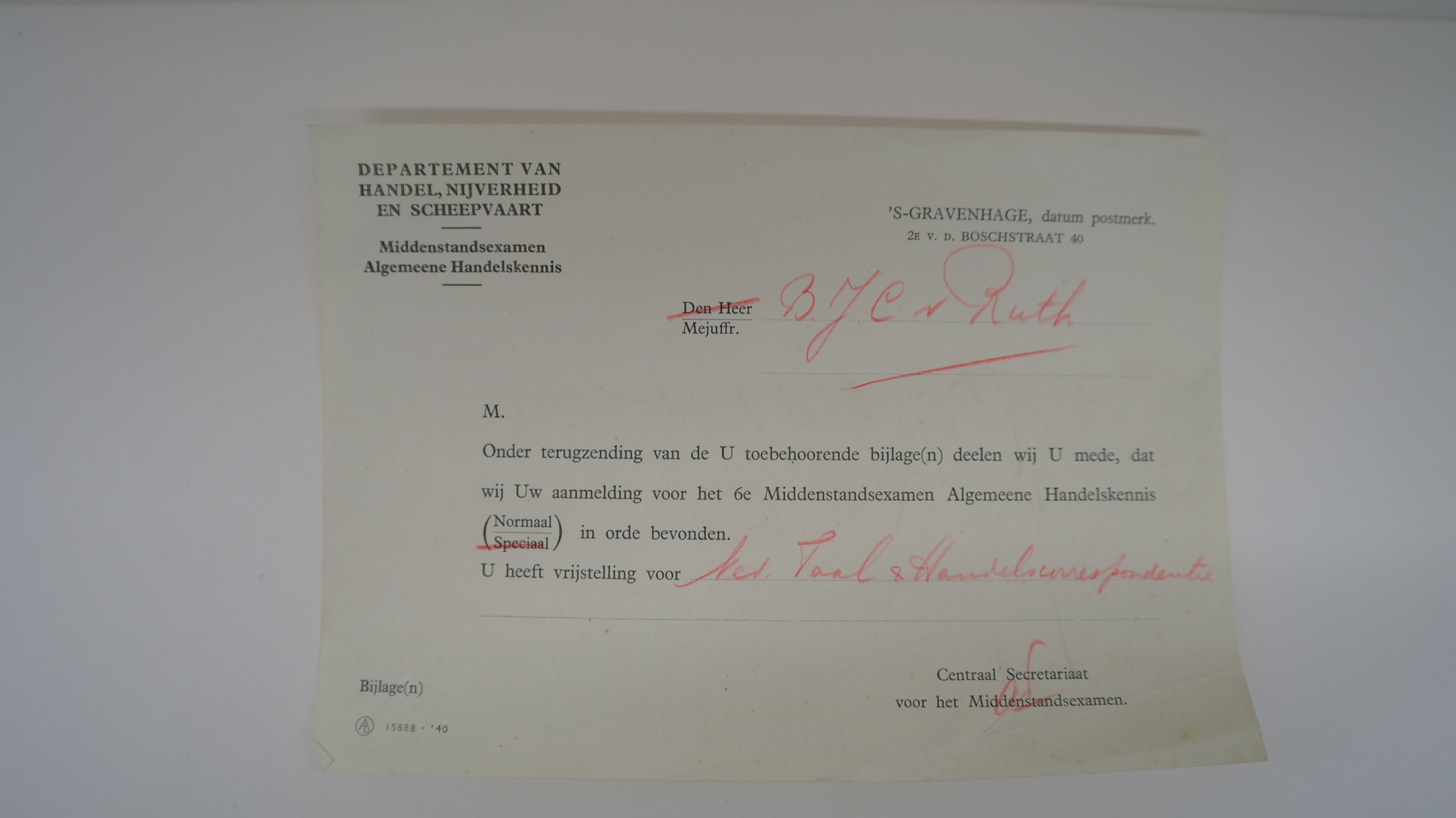 Bericht van het departement van handel, nijverheid, en scheepvaart dat de aanmelding van B.J.C. Van Ruth voor het middenstandsexamen algemene handelskennis in orde is.