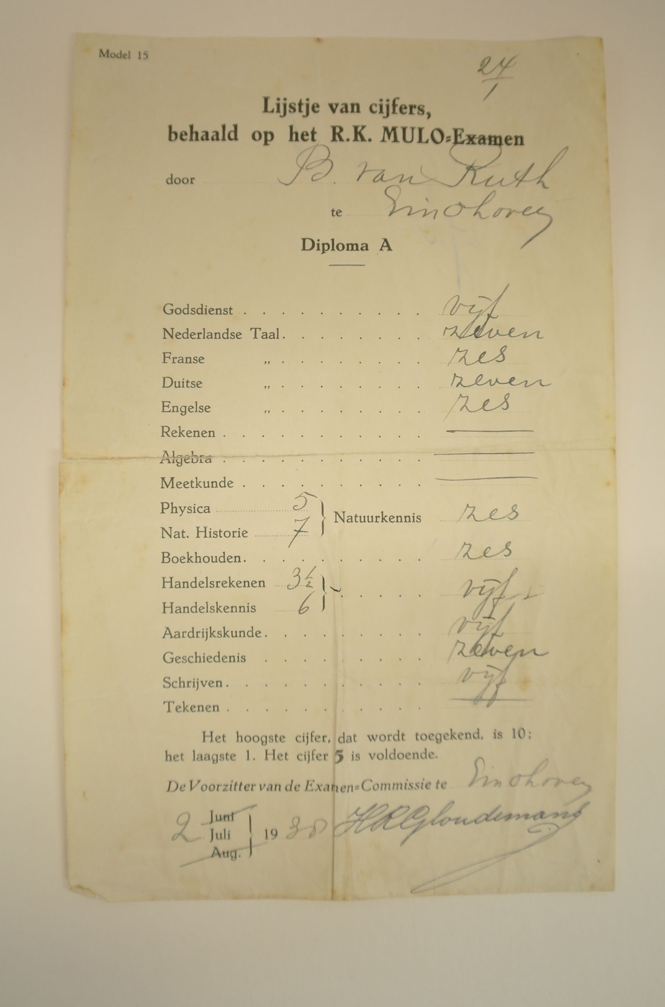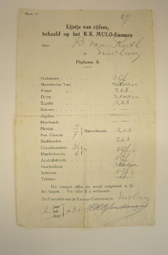 Puntenlijst diploma A behaald door B. Van Ruth op het Mulo-examen