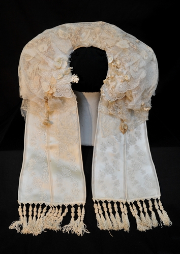 Poffer, kleur: wit vier linten geborduurde satijn met franje, bloemen bedekt, witte bloemen