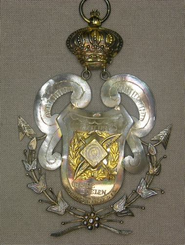 Prijsmedaille handboogschutterij, materiaal: zilver, medaille bestaande uit een centraal geplaatst schild met inscriptie: 'Rozenprijs Oranje Doelen Woensel 12-19- 5 - 12' gevat tussen twee symmetrisch geplaatste ornamentele krullen met pijlpunt en beneden twee elkaar kruisende symmetrisch geplaatste bloemtakken. Op het schild een schietschijf over een lauwerkrans met pijl-en-boog motief. Bovenaan een scharnierend kroontje met bolkruisje ...