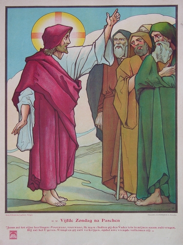 Schoolplaat: No. 57 Vijfde Zondag na Paschen. Jezus in gesprek met zijn leerlingen. Gesigneerd, gemonogrammeerd (met monogramteken) en gedateerd in voorstelling r.o..: Jos. Speybrouck, onder voorstelling r.o.: Chromolith. J.L. Goffart SA Bruxelles, l.o. logo van Liturgisch Apostolaat Uit de reeks 'Liturgisch apostolaat'