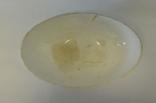 Diepe schaal - z.j., witbakkend geglazuurd aardewerk, afmetingen: 8 x 25,5 cm, op de onderzijde van de bodem gemerkt: 'Petrus Regout en Co Maastricht' (omkaderd), blindstempel: '9' (sterk verweerd) gemerkt: Petrus Regout en Co Maastricht (omkaderd) blindstempel: 9 (sterk verweerd)