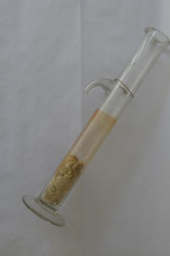 Glazen buis op een ronde standvoet, met een naar benden gebogen glazen aanzetstukje als een soort kraantje