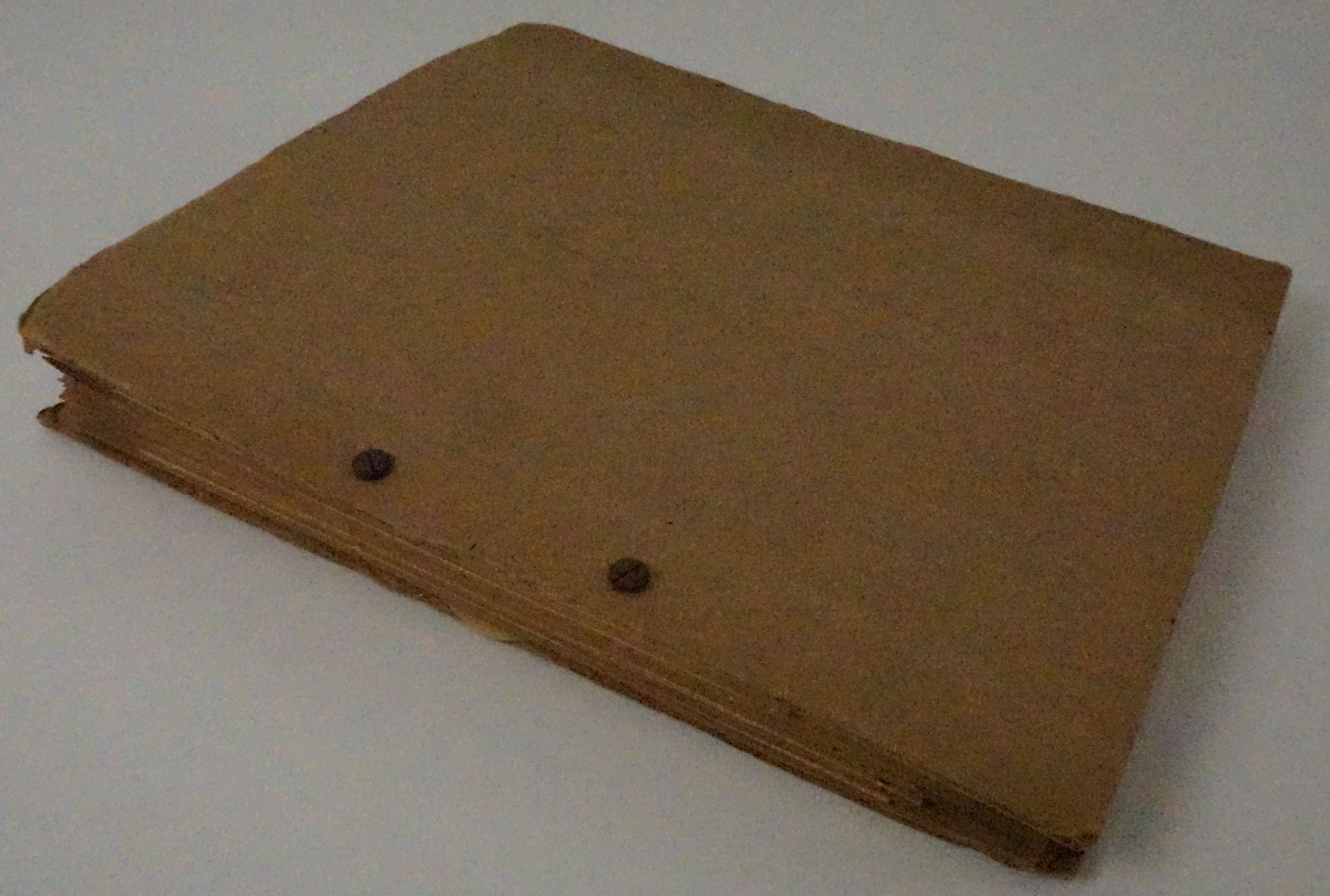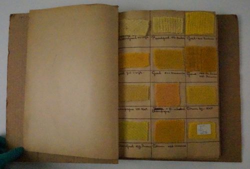 Verfstalenboek, materiaal: divers, kleur: karton, lengte 33,5 cm., breedte 28,5 cm., stalen geplakt op papier, gekaft met karton en twee koperen schroerven voor stalenboek