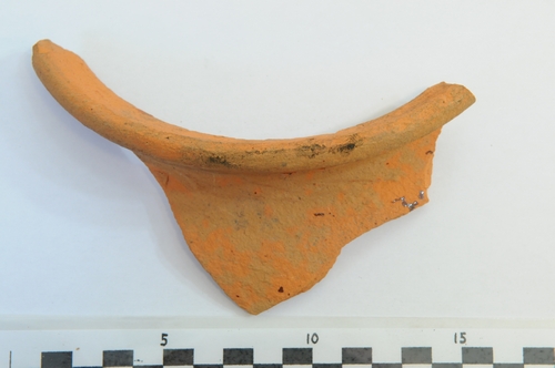 Randfragment van een kookpot van roodbakkend aardewerk met sporen van donkerbruine glazuur op de buitenzijde. Vervaardigd uit tertiaire klei, herkomst Belgische Kempen of Midden-Brabant. Gevonden bij graafwerkzaamheden op het terrein van de oude gasfabriek tussen de Wal en de Paradijslaan in december 1988