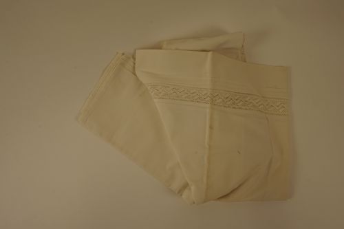 Laken, materiaal: katoen, kleur: wit, lengte 227 cm, breedte 155 cm, bovenkant met machinale kanten entre-deux, 2 ingestikte plooitjes, kanten tussenzetsel 5.0 cm breed, gemerkt: S.M. 1155, machinale stoppen,versteld