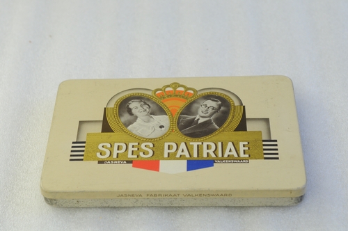 Sigarendoosje 'Spes Patriae Jasneva Valkenswaard Amarillo' - 2e t/m 3e kwart van de 20e eeuw, materiaal: blik, afmetingen: 1,7 x 17,2 x 11,3 cm, sigarendoosje voor 10 sigaren Amarillo Jasneva Valkenswaard, op de buitenzijde van het deksel afbeelding: print van Juliana en Bernhard in een ovaal met verbindend kroontje tussen beiden tegen een oranje fond, ...