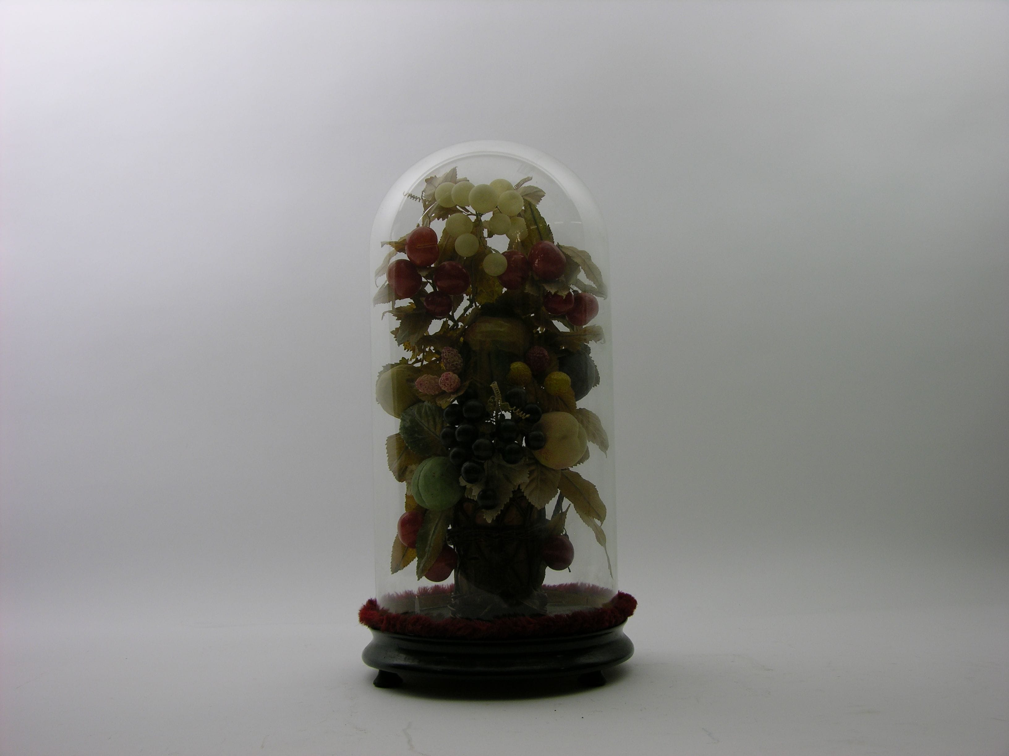 ronde stolp vruchtenkrans: rood, wit, blauw vaasje: beige met bruin gevlochten mandje oud inventarisnummer: 238 zelfde nr als 1981.01.640 lit.: Antiek, vierde jaargang nr 10 - 1970, artikel: Kunstbloemen, kunstvruchten en een Madonna achter glas, J. de Klein