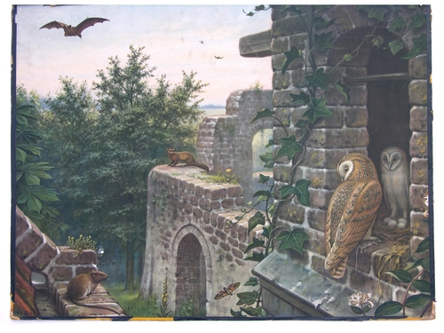 tweezijdig bedrukte wandplaat met voorstelling van geraamte van vissen en van roofdieren in hun natuurlijke omgeving wandplaten uit de serie: dieren in hun omgeving - eerste serie: in ons land uitgave: Wolters