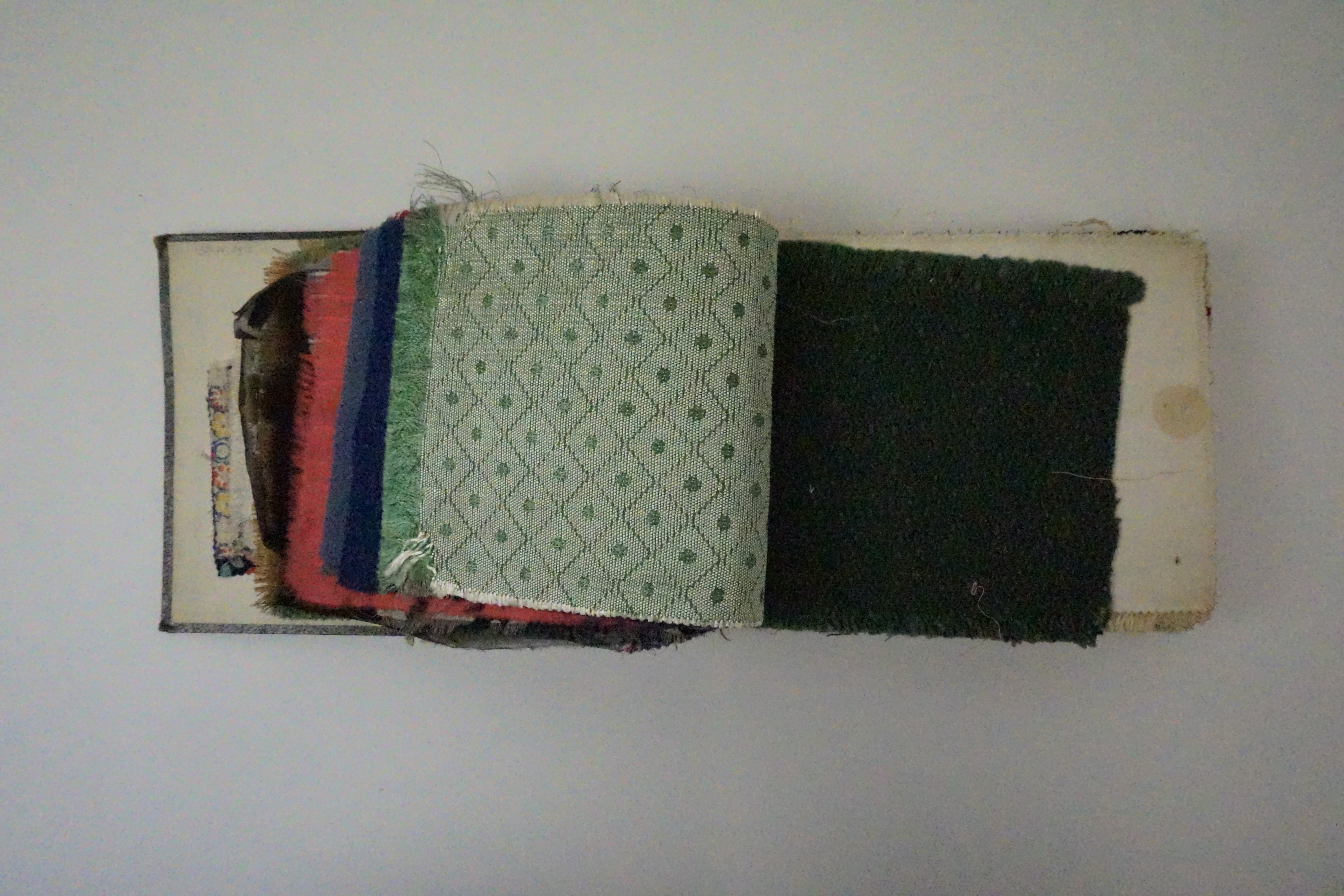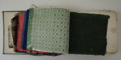 Stalenboek, materiaal: divers, kleur: divers, lengte 29,5 cm., breedte 20 cm., hoogte 6 cm., 73 stuks diverse stalen stof, o.a. schorten, h. dl. goed, bekleding, matrassen tijk, enz.