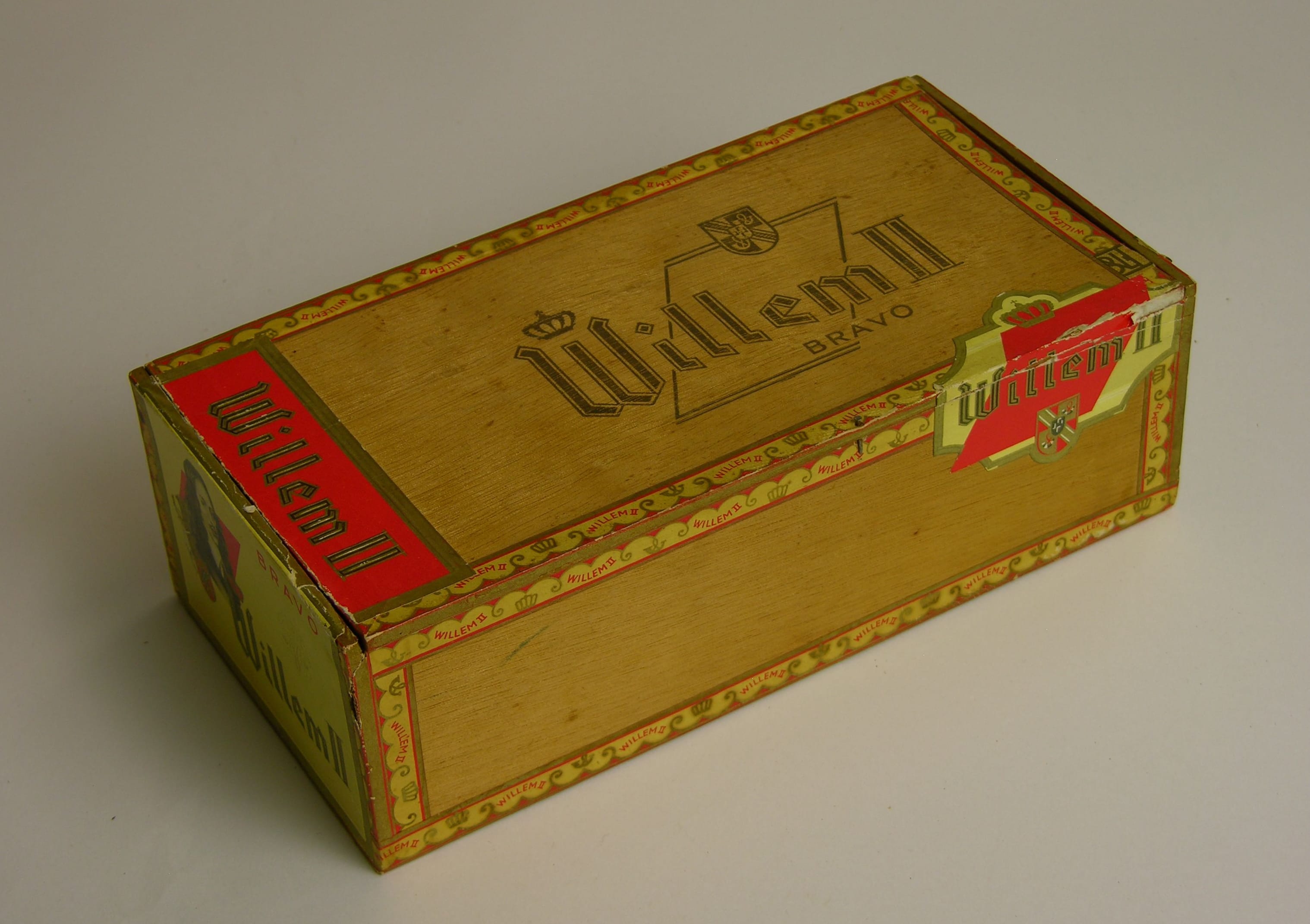 Sigarenkistje ' Willem II Amarillo' - 2e helft van de 20e eeuw, materiaal: hout en chromolithografie/papier, afmetingen: 7,5 x 24 x 12,2 cm, sigarenkistje voor 50 Willem II Amarillo sigaren, tekst ingeprint op de buitenzijde van het deksel, tegen de binnenzijde van het deksel papier met reliëfopdruk Willem II Bravo met portret en wapenschild
