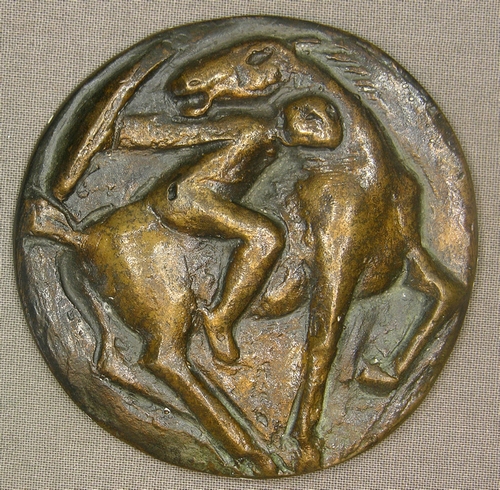 Eenzijdige penning met op beeldzijde afbeelding van krijger te paard