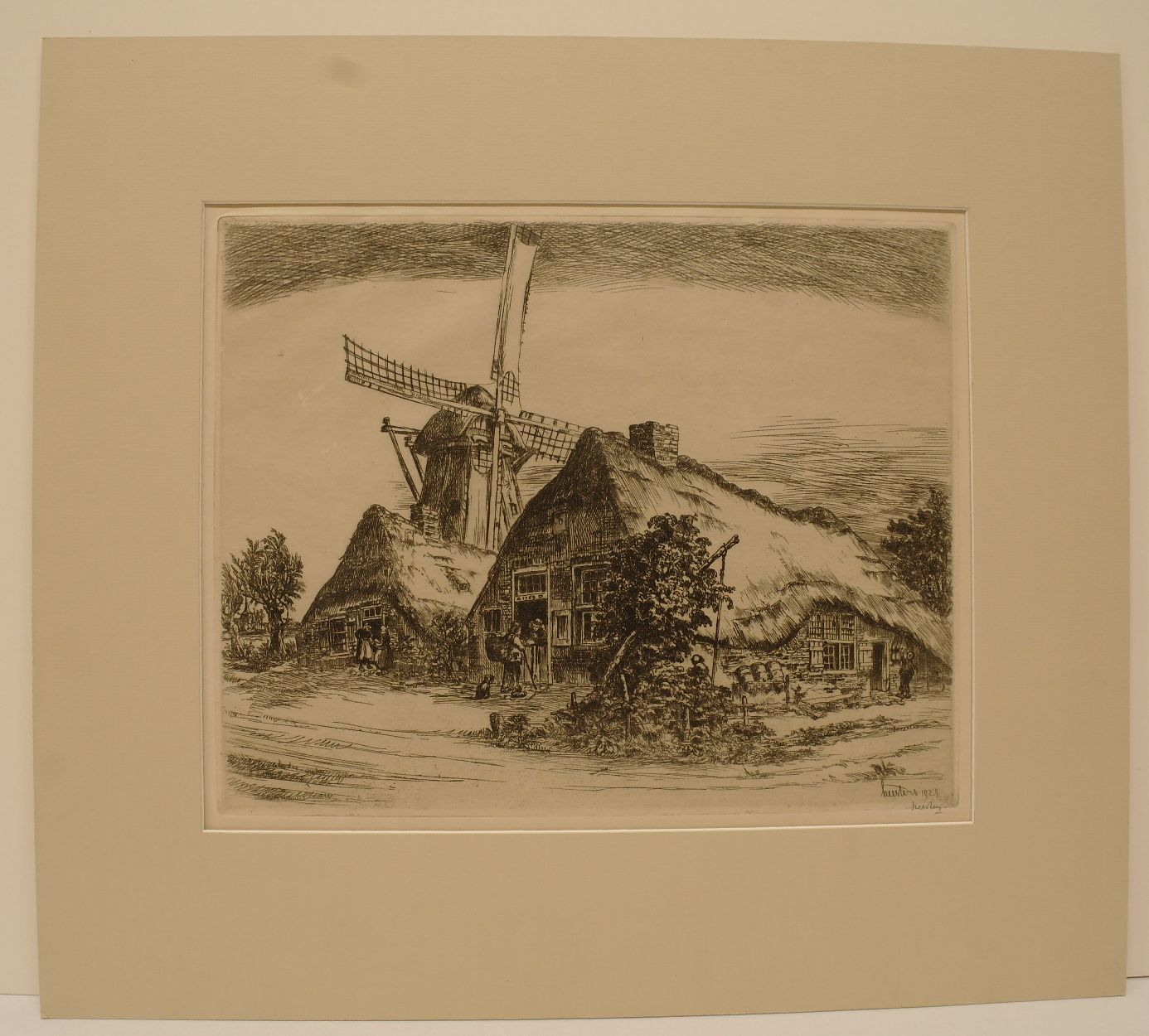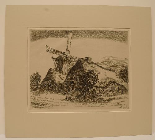 Molen met boerderijen te Dinther – 1929, ets in zwart/papier door Jan Heesters, 240 mm hoog, 300 mm breed, gesigneerd en gedateerd r.o in plaat “heesters 1929”, gesigneerd in potlood r.o. “heesters”