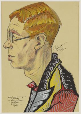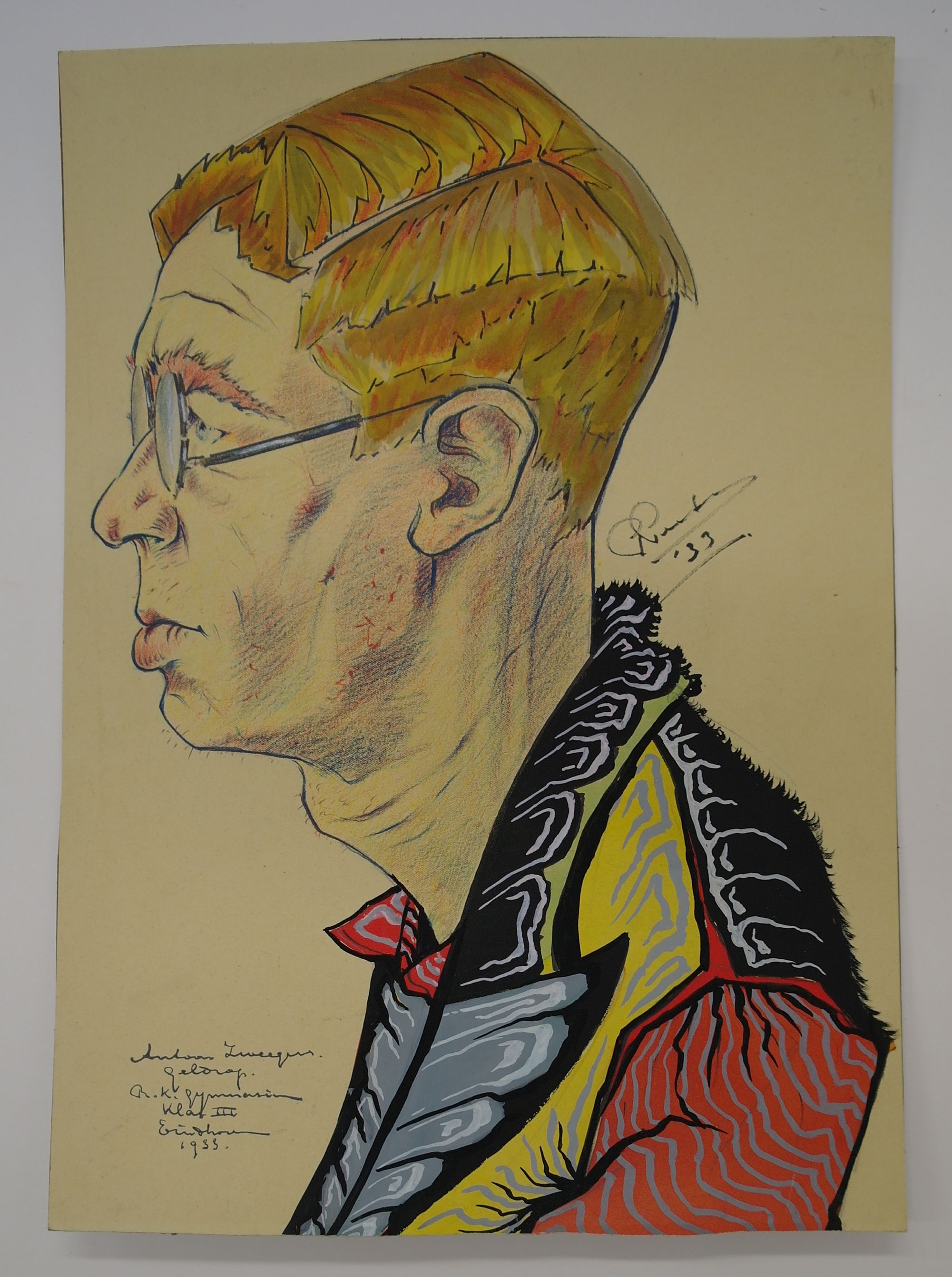 Karikatuur van Antoon Zweegers - 1933, kleurkrijt/gouache/oostindische inkt/papier, 40.4 x 28.7 cm, gesigneerd m.r.: PPeeters '33, geannoteerd, gelocaliseerd en gedateerd l.o.: Antoon Zweegers, Geldrop R.K. gymnasium Klas III Eindhoven 1933