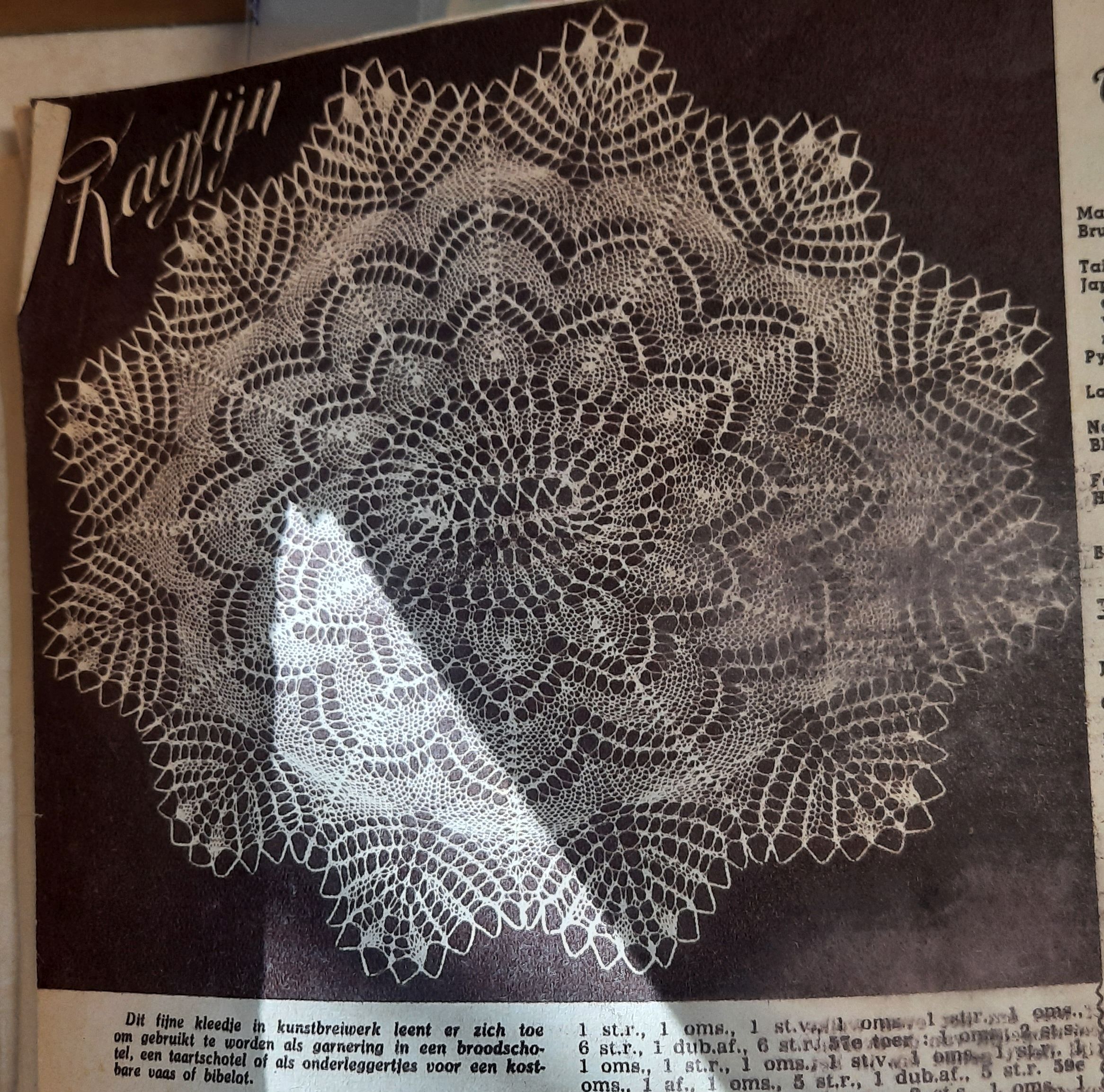 Twee gebreide tafelkleedjes – ca. 1949, materiaal: katoen, kleur: wit, diameter 24 cm, met patroon, blz. 26 uit het Rijk der Vrouw 208, 1949