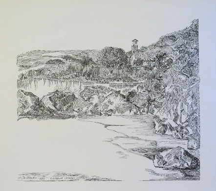 Westpunt Curacao – 1970, oostindische inkt/papier, 375 x 415 mm, gesigneerd, gedateerd en gelocaliseerd l.o.: H. JAN SCHOUTEN 1970 - Westpunt Curacao
