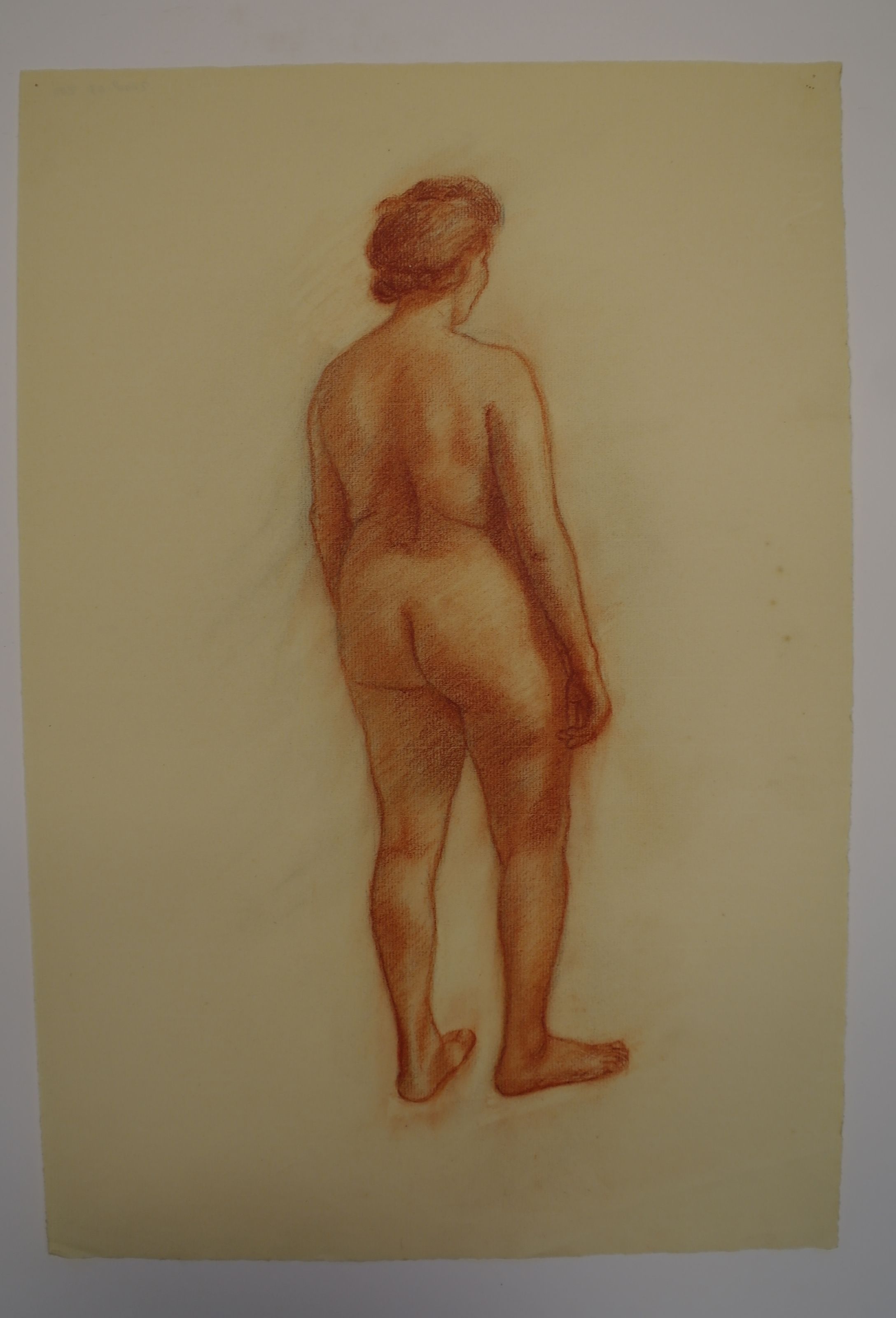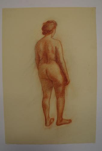 Tekening van naakte vrouw ten voeten uit en van achteren gezien