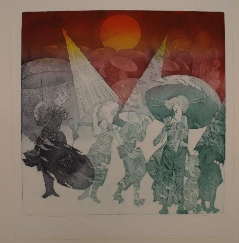 Parasols – 1994, ets en aquatint in kleur/papier (oplage 35), 498 x 500 mm, getiteld, geannoteerd, genummers en geannoteerd potlood l.o.: PARASOLS ets aquatint 21/35 eigen druk, gesigneerd potlood r.o.: michael jepkes