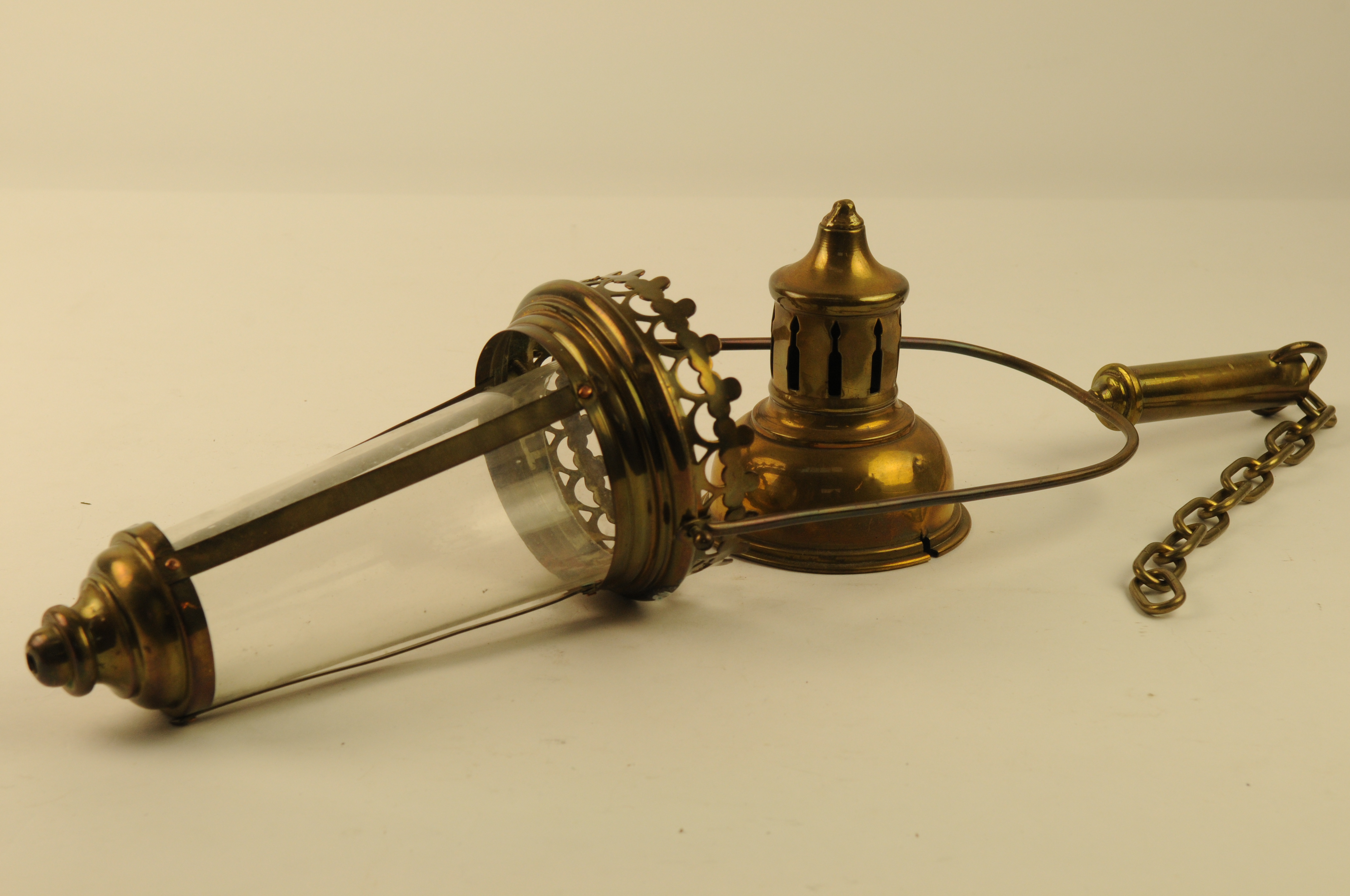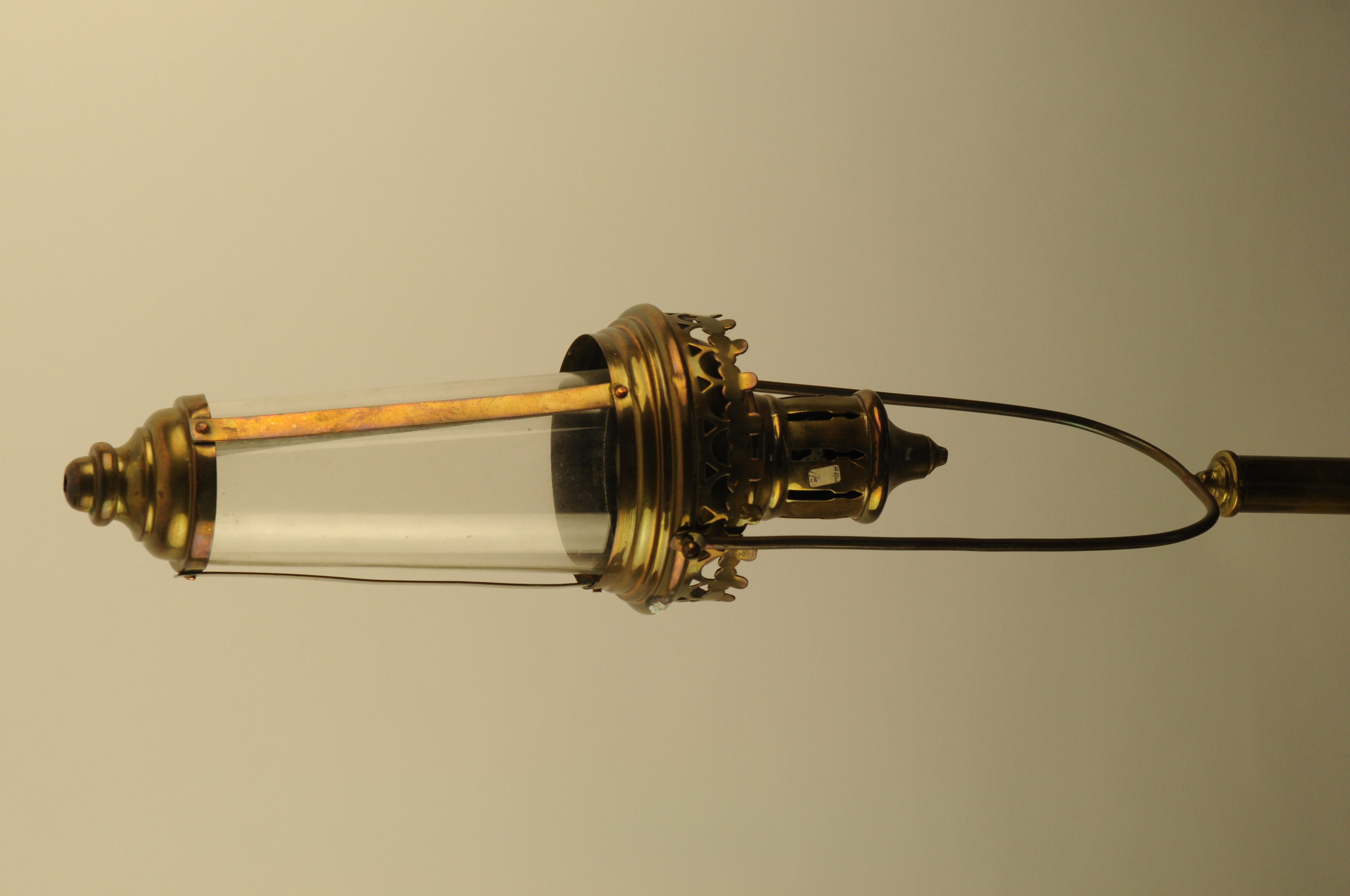 Flambouw (processiekaarsen-drager), messing en glas (voor op rijtuig ?), 36 x 13 cm, in zwenkbare houder met aanzet voor draagstok